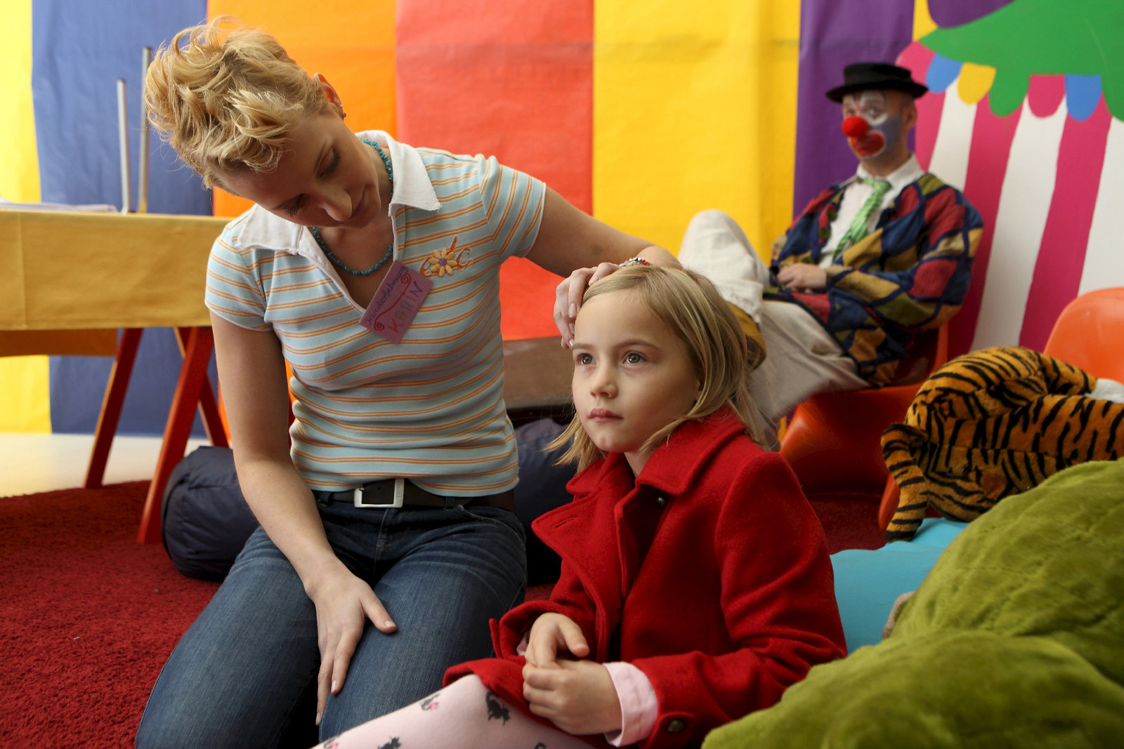 VerantwortungLotta (Janine&Jessy Aschersleben) wartet vergeblich bei der Kinderbetreuerin (Miriam Rixen) auf ihren Ziehvater Bert de Vries.Bild: © ZDF und Daniela Incoronato