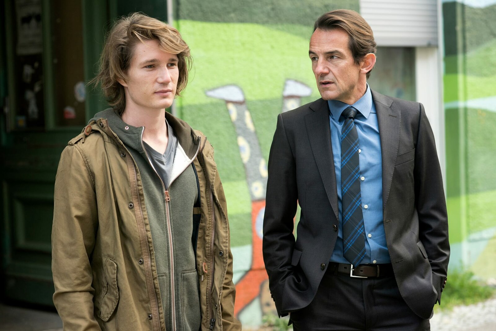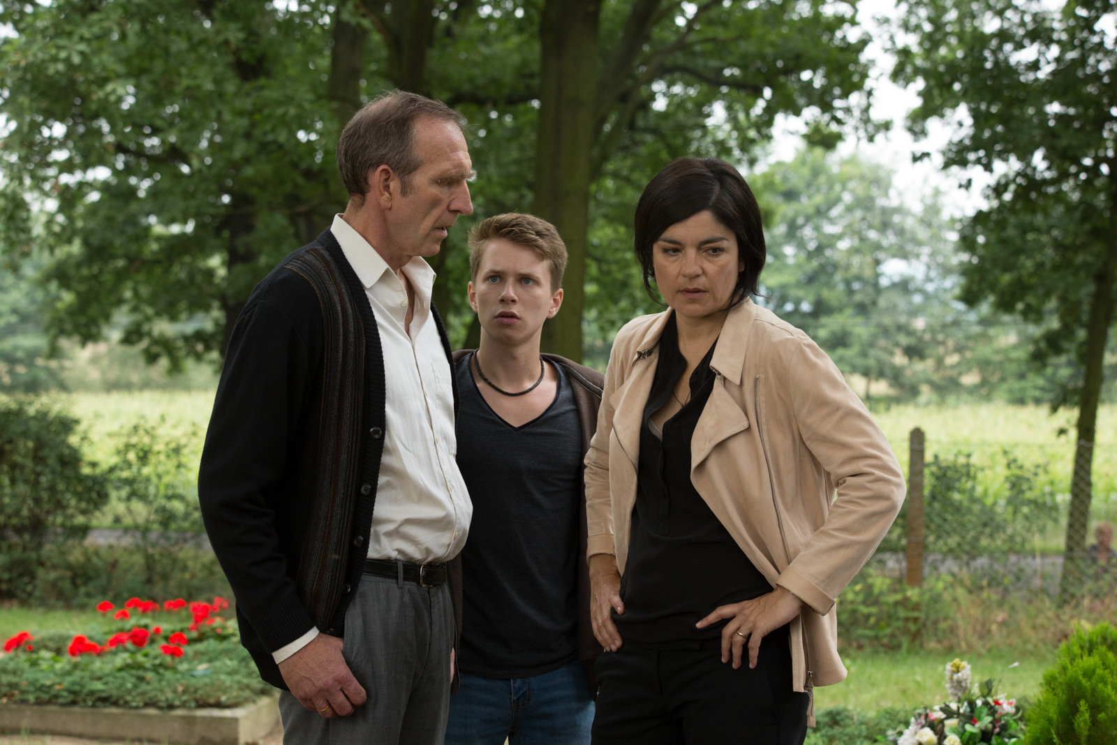 Monster (2)Pfarrer Drews (Jochen Nickel, l.) wirft Mina (Jasmin Tabatabai, r.) vor, dass sie und ihre Kollegen Schuld an der Entführung seiner Tochter Jenny seien, als Noah (Lukas Schust, l.), Jennys Freund, dazukommt.Bild: © ZDF und Frédéric Batier