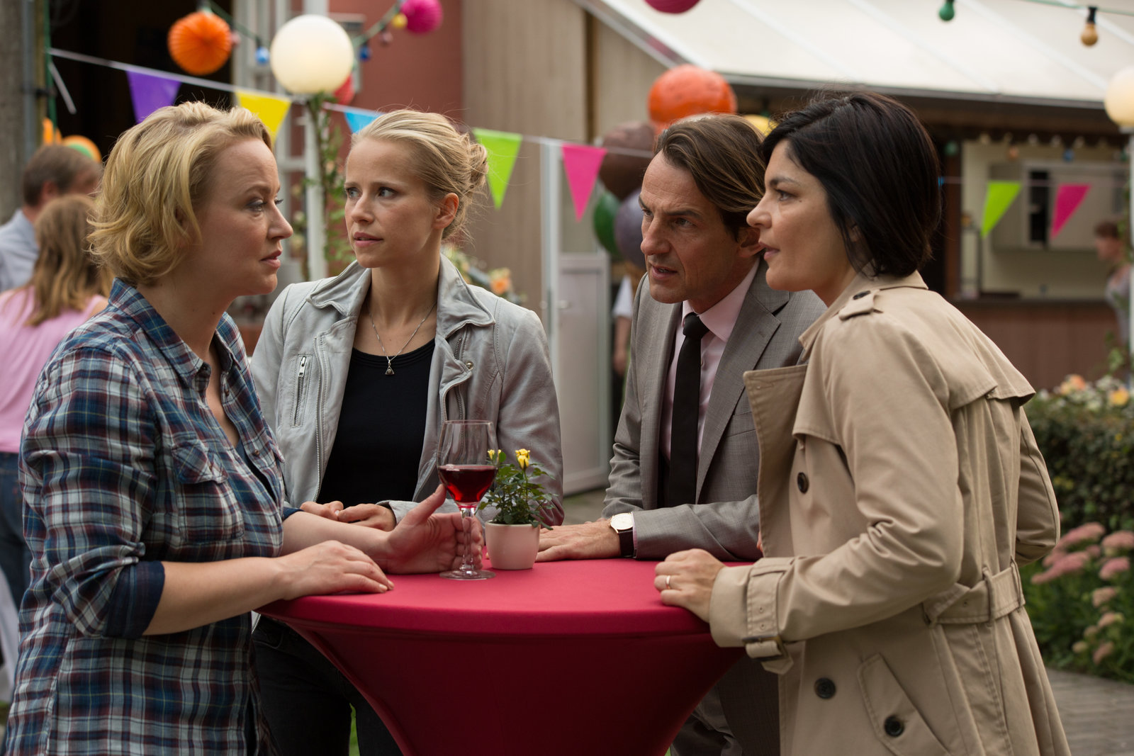 AllesfresserCorinna Hoffmann (Floriane Daniel, l.) ist sprachlos: Oliver Radek (Hans-Werner Meyer), Mina Amiri (Jasmin Tabatabai, r.) und Sandra Reiß (Susanne Bormann, 2.v.l.) vermuten, dass Animal Soldiers einen Anschlag während der Jubiläumsfeier von "Gemeinsam Bio e.V." geplant hat, bei der sie gerade den Neubau der Anlage in Betrieb genommen hat.Bild: © ZDF und Frédéric Batier