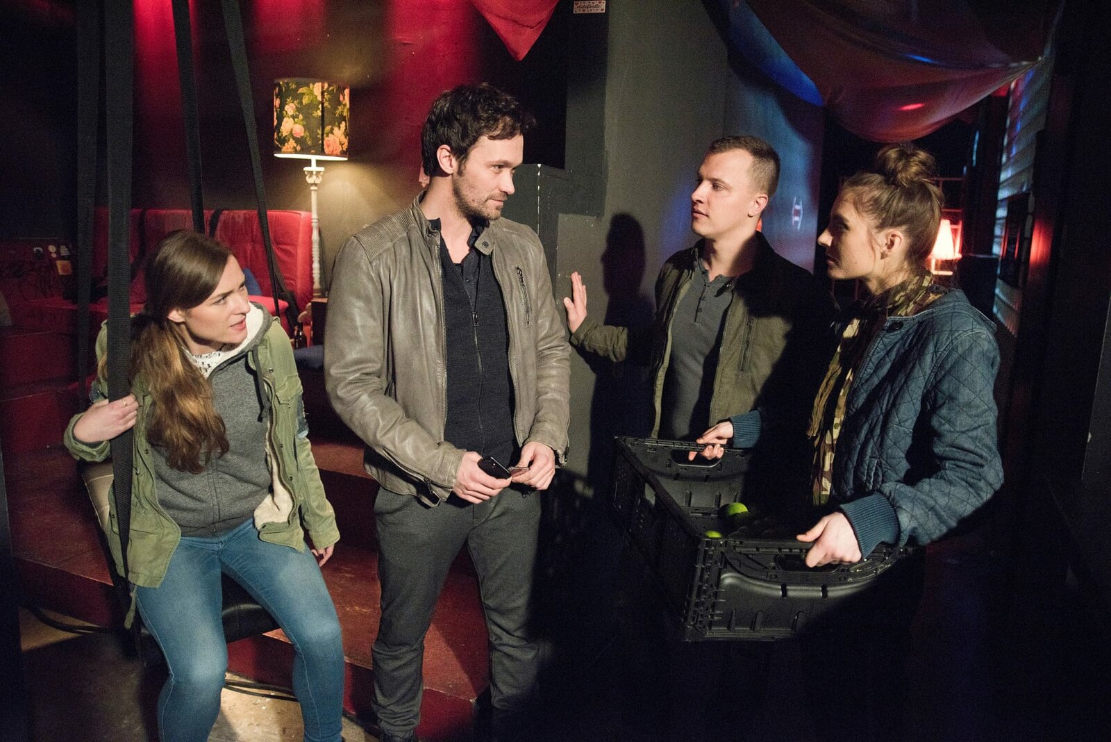 DämonenDie Betreiber des Hedonistenclubs, Laura Wagner (Sophie Bogdan, r.) und Dennis Kiefer (Tim Kalkhof, 2.v.r.), bestâtigen Lucy (Josephin Busch, l.) und Alex (Aleksandar Radenkovic, 2.v.l.), dass Anja vor einigen Monaten regelmâ?ig an ihren Partys teilnahm. in Verbindung mit der Sendung bei Nennung ZDF/Oliver FeistBild: © Oliver Feist / Die Verwendung ist nur bei redak / ZDF / © ZDF/Oliver Feist