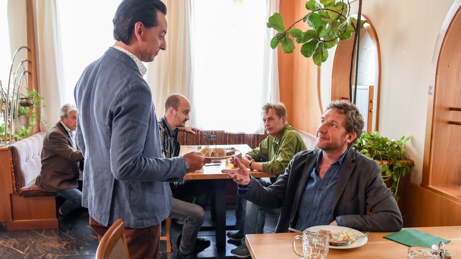 v.li.: Sachverständiger (Julian Loidl), Gast (Patrick Seletzky), Gast (Franz Weichenberger), Paul Schwartz (Johannes Zeiler).Bild: © Hubert Mican / ORF / MR Film