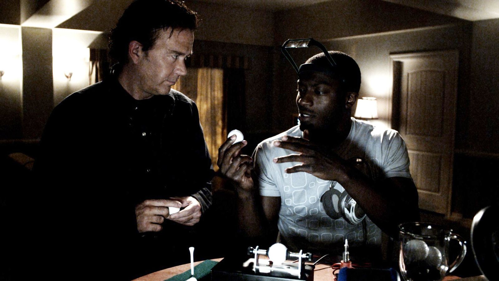 Ring FreiDas Leverage-Team möchte den dubiosen und raffgierigen Chef des Sportstudios um sein Geld bringen. Um den ersten Kontakt herzustellen, muss Nate (Timothy Hutton, l.) auf dem Golfplatz gegen ihn antreten. Alec (Aldis Hodge) manipuliert die Golfbälle zu Nates Vorteil.Bild: © RTL Crime
