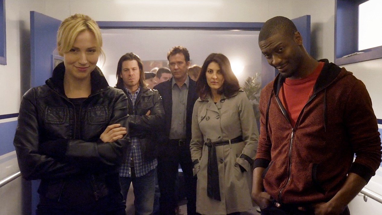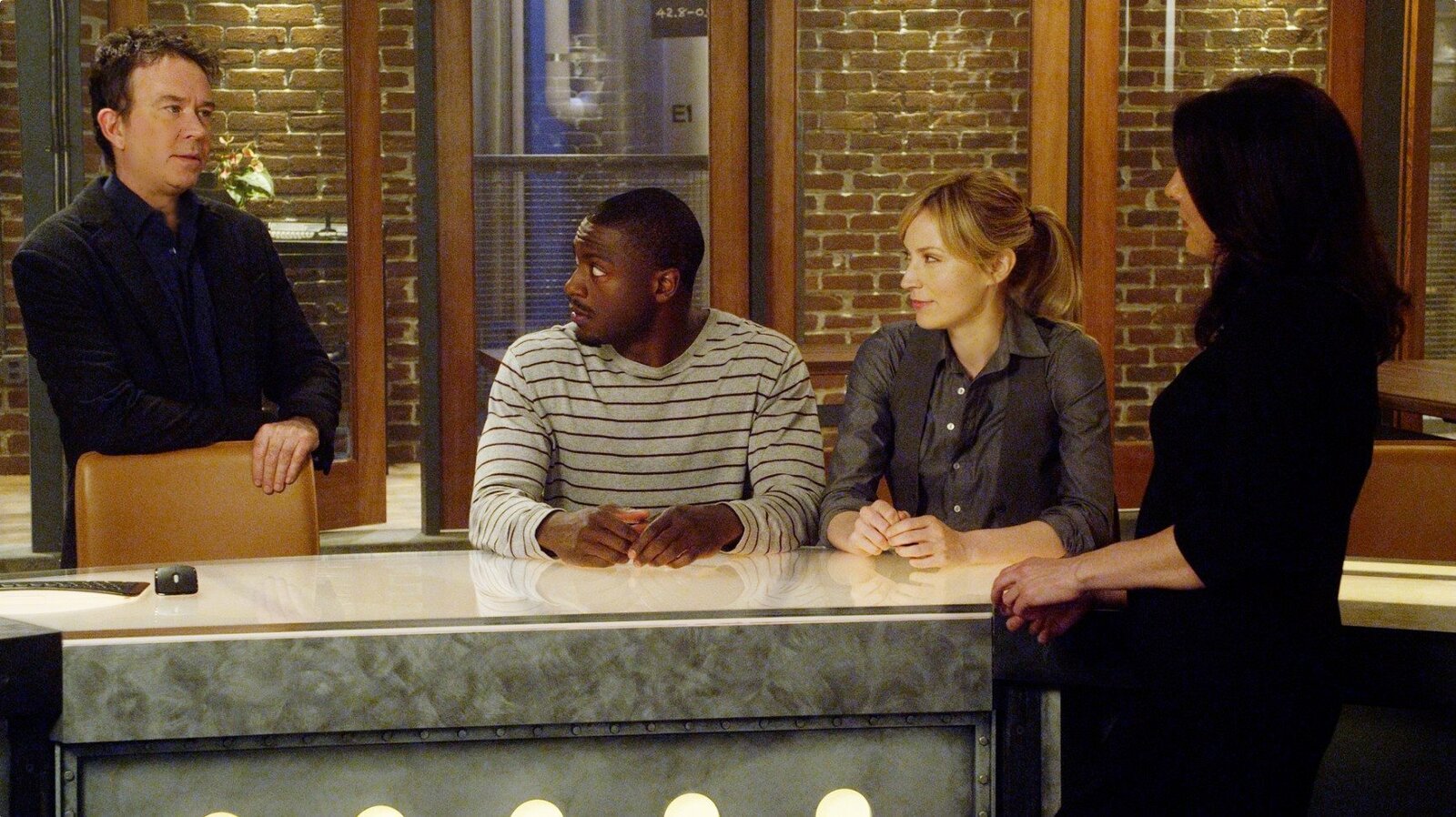 Die GeschworeneV.l.: Das Team, Nathan Ford (Timothy Hutton), Parker (Beth Riesgraf), Alec Hardison (Aldis Hodge), Sophie Devereaux (Gina Bellman) und Eliot Spencer (Christian Kane) trifft sich zur Lagebesprechung.Bild: © RTL Crime