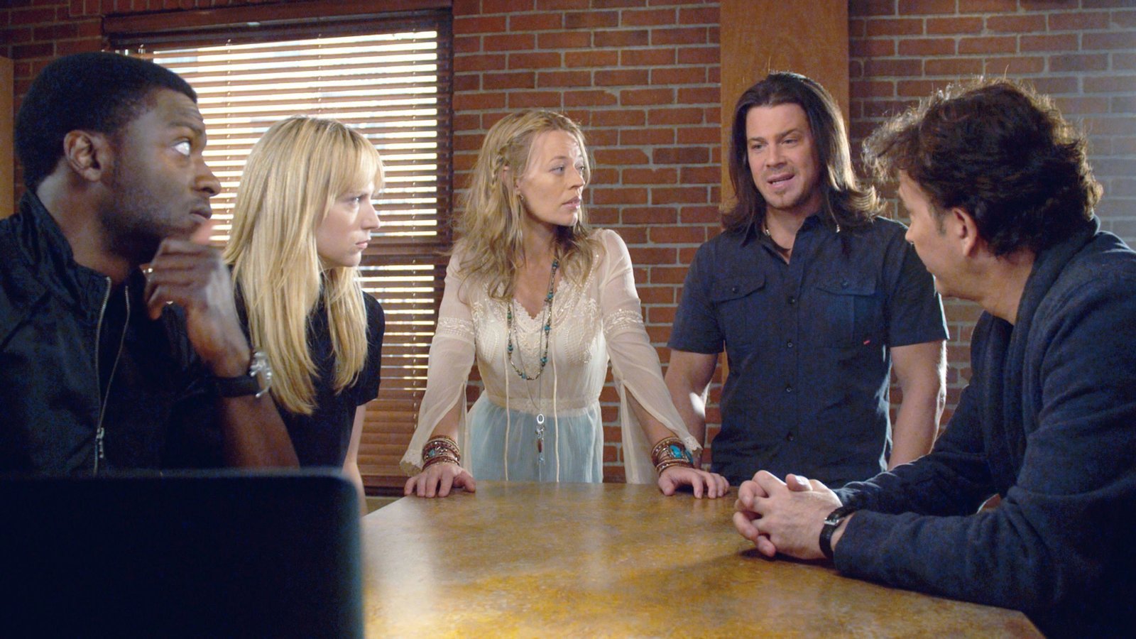 ScharlatanDas Leverage-Team schmiedet einen Plan: V.l.: Alec Hardison (Aldis Hodge), Parker (Beth Riesgraf), Tara Cole (Jeri Ryan), Eliot Spencer (Christian Kane) und Nate Ford (Timothy Hutton) wollen einem vermeintlichen Hellseher auf die Schliche kommen.Bild: © RTL Crime