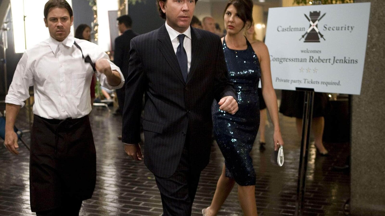 Unter BeschussVon links: Kellner (Darsteller unbekannt), Nathan Ford (Timothy Hutton) und Sophie Devereaux (Gina Bellman)Bild: © RTL Crime / TNT
