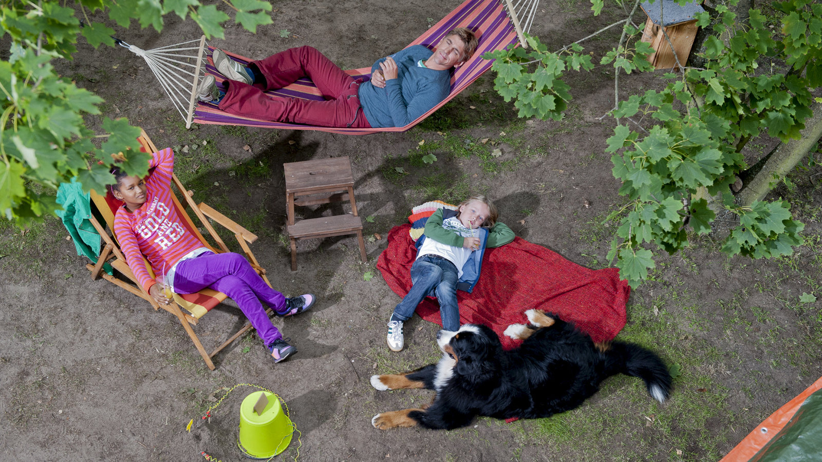 Maulwurf - Der unsichtbare UntermieterLöwenzahn Folge "Maulwurf - Der unsichtbare Untermieter", Fritz Fuchs (Guido Hammesfahr), Milly, (Marie Madeleine Ipoumb), Victor (Finn Fiebig) und Keks machen Pause. Wie lange hat der Maulwurf wohl nach einem neuen Zuhause gesucht?Bild: © ZDF und Antje Dittmann