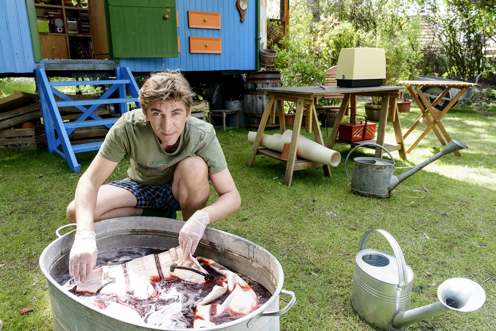 Kleidung - Der Weg der roten HoseNoch Färben - in Rot natürlich - dann ist Fritz' (Guido Hammesfahr) neue Hose bald fertig.Bild: © ZDF/Antje Dittmann