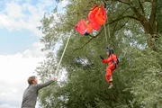 Fallschirm - Die verflixte LandungIrgendwie muss er doch die abgestürzte Rosi (Renate Serwotke) samt Fallschirm aus der Baumkrone bekommen. Fritz Fuchs (Guido Hammesfahr) gibt alles.Bild: © ZDF und Antje Dittmann