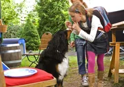 Gummi - Kautschuk für den KioskLilly (Sophie Karbjinski, v.) und Elsa (Malina Schreiber, h.) nutzen einen unbeobachteten Moment, um Fritz Fuchs' (Guido Hammesfahr) selbst hergestelltes Kaugummi unauffällig zu entsorgen. Bei Hund Keks ist ihr Geheimnis gut aufgehoben.Bild: © ZDF und Antje Dittmann.