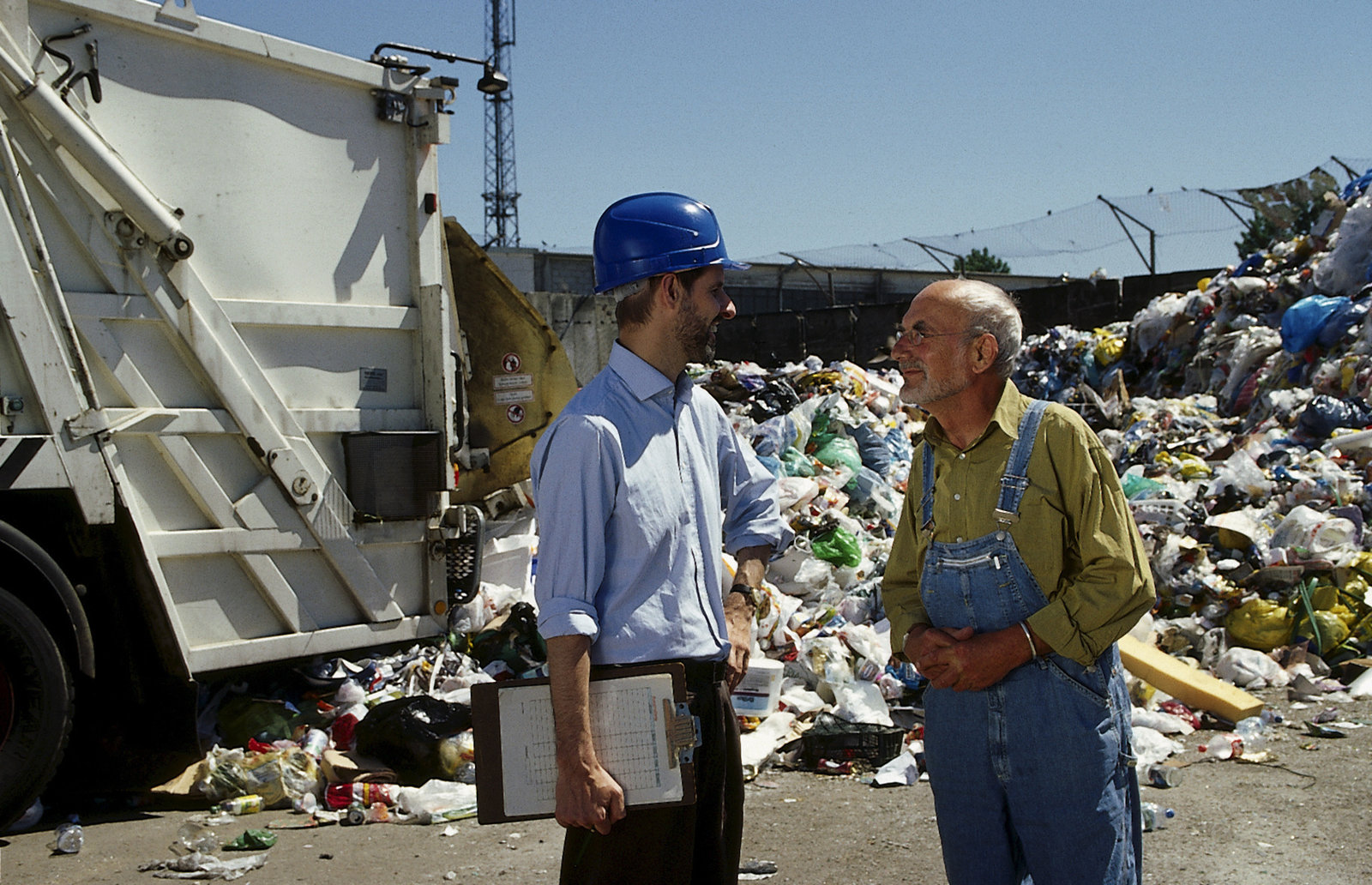 Peters Müll-TourZwischen Bärstadts riesigen Müllbergen ist Peter Lustig (Peter Lustig, r.) auf der Suche nach einem wertvollen Gartenzwerg. So eine Frage hatte der Betriebsleiter (Frank Arnold, l.) noch nie.Bild: © ZDF und Christiane Pausch