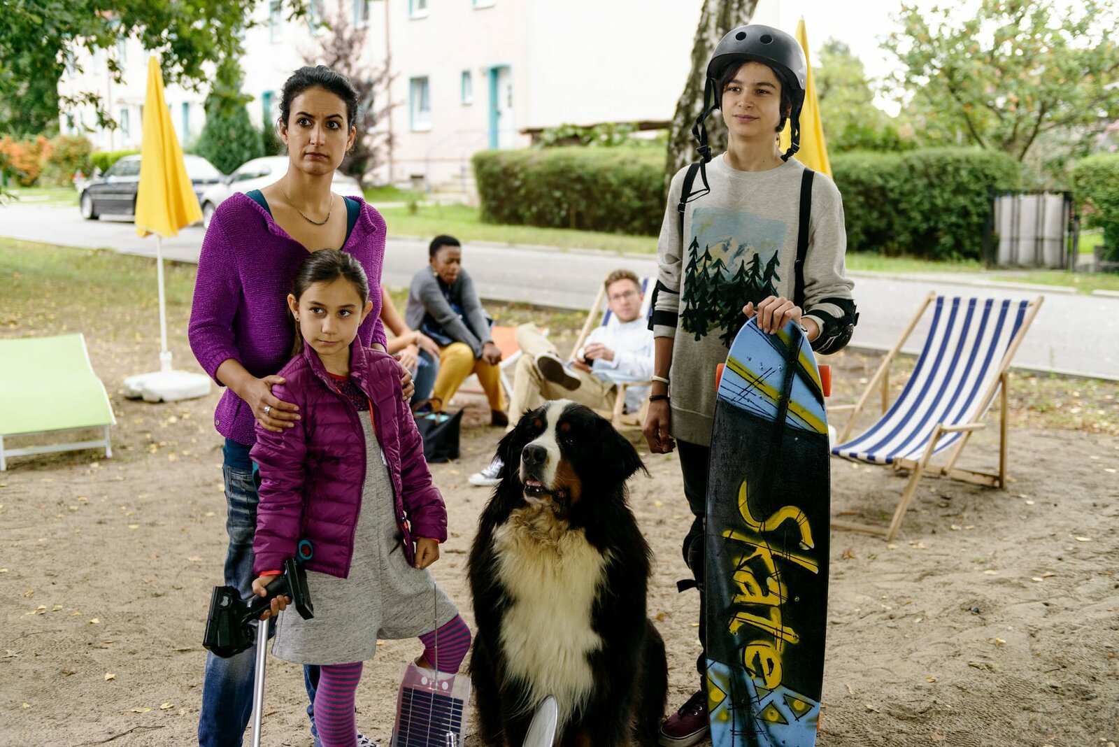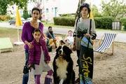 Elektromobil - Der Weg zum MarsAus der Traum!? Mit dem Gipsbein geht es für Minoo (Katerina Gehrckens, 2. v. l.) nicht mit auf Klassenfahrt zum Raumfahrtzentrum. Yasemin (Sanam Afrashteh, l.) und Minoos älterer Bruder Hadi (Alexander Türk, r.) stehen ihr zur Seite.Bild: © ZDF und Antje Dittman./Antje Dittman