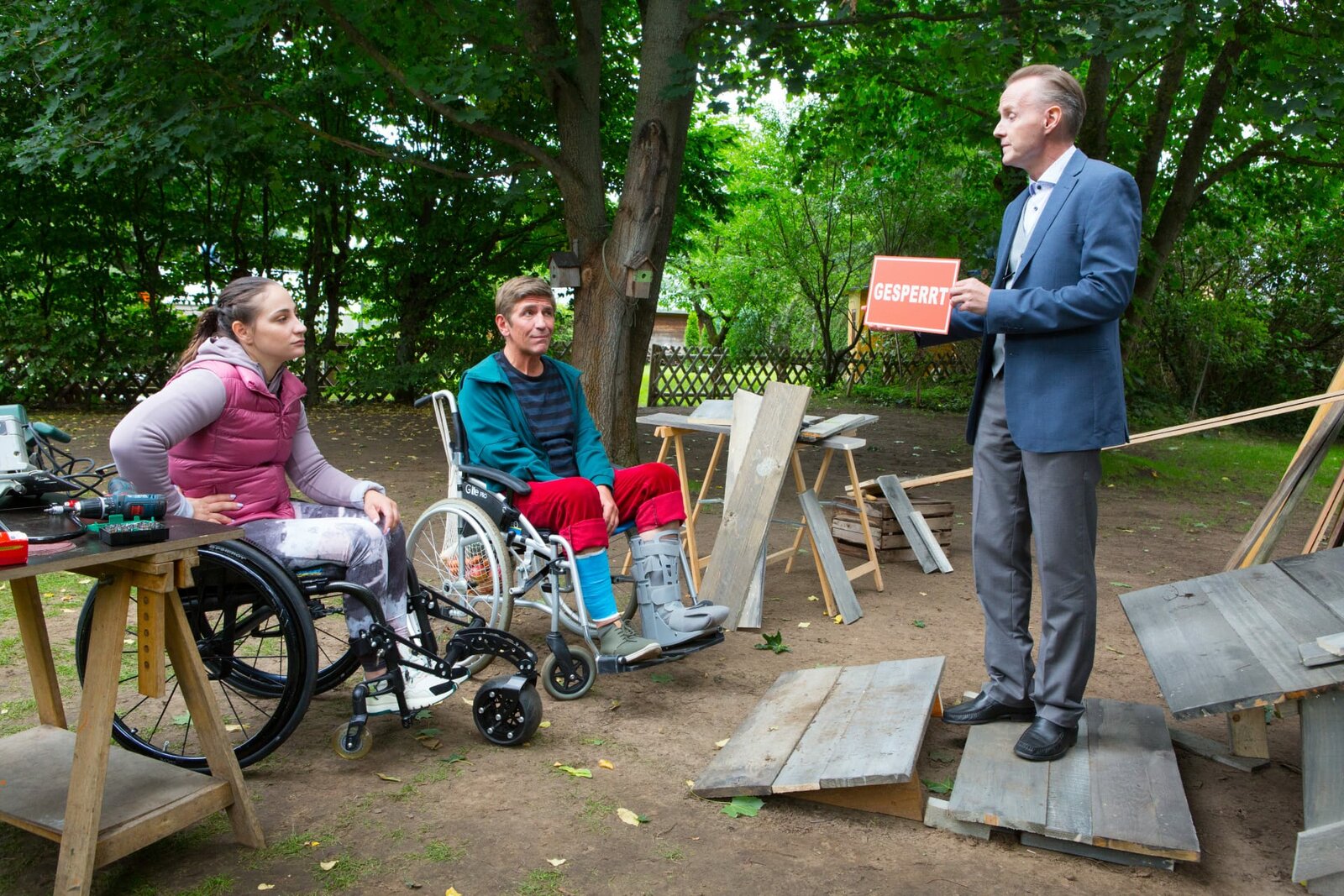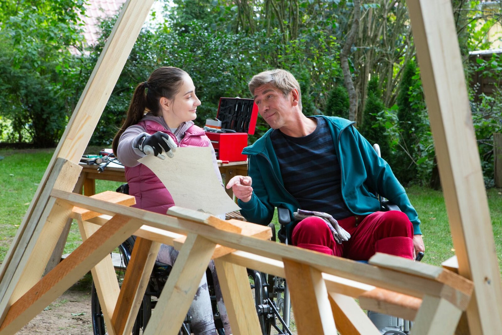 Gemeinsam stark - Eine Rampe für die RollisJulia (Kristina Vogel) und Fritz Fuchs (Guido Hammesfahr) haben einen Plan - sie wollen eine Rampe für den Bauwagen bauen. Seit einem Unfall sitzt Fritz für einige Wochen im Rollstuhl, deshalb braucht er Hilfe, um weiter im Bauwagen wohnen zu können.Bild: © ZDF und Zia Ziarno.