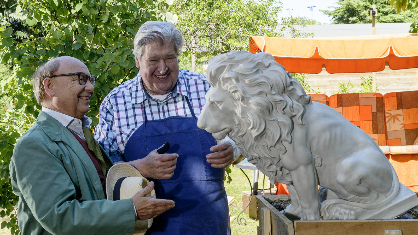 Sand - Die Sphinx von BärstadtProfessor Nachtigall (Hans-Joachim Heist, l.) freut sich auch bei Herrn Paschulke (Helmut Krauss, r.) im Garten 'große Kunst' zu entdecken.Bild: © ZDF und Antje Dittmann