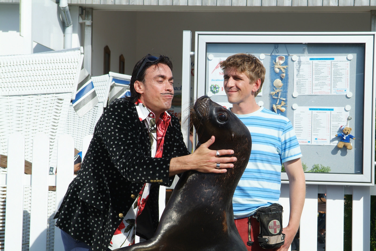 Robben - Ein Fischfresser auf LandgangWieder vereint: Fritz Fuchs (Guido Hammesfahr, r.) übergibt Robbe "Ronnie" ihrem Besitzer (Claudio Maniscalco, l.). Der freut sich, seinen entlaufenen Schützling wieder in die Arme schließen zu können.Bild: © ZDF und Christiane Pausch