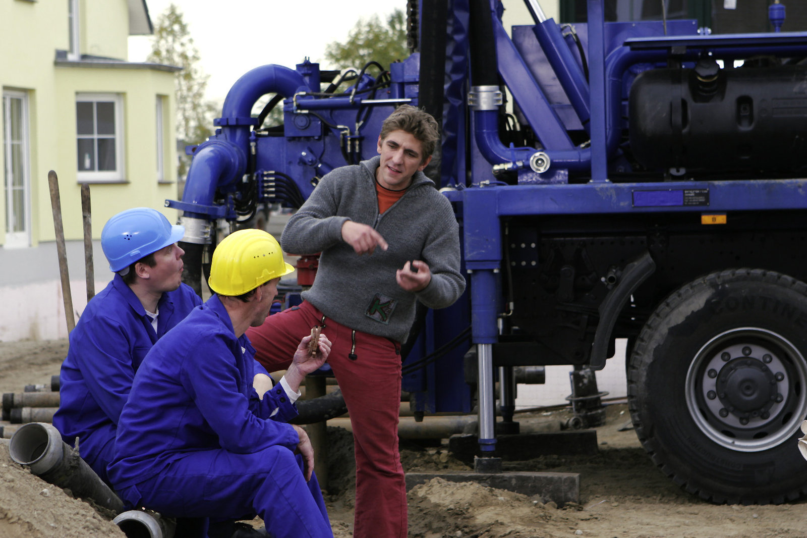 Erdwärme - Heißes Pflaster in BärstadtFritz Fuchs (Guido Hammesfahr) muss all seine Überredungskünste ausspielen, damit ihm die Arbeiter einer Bohrfirma Zutritt gewähren. Fritz will wissen wie genau Anlagen für Erdwärmeheizungen aussehen und funktionieren.Bild: © ZDF/Antje Dittmann