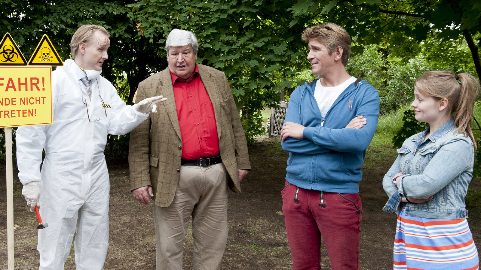 Bakterien - Die Bärstadt-BazilleFritz Fuchs (Guido Hammesfahr) und seine Kusine Charlie (Géraldine Raths) haben Ordnungsamtmann Kluthe (Holger Handtke, li.) und Nachbar Paschulke (Helmut Krauss) einiges zu erzählen. Die beiden haben behauptet, sie hätten gefährliche Bakterien gezüchtet.Bild: © ZDF/Antje Dittmann