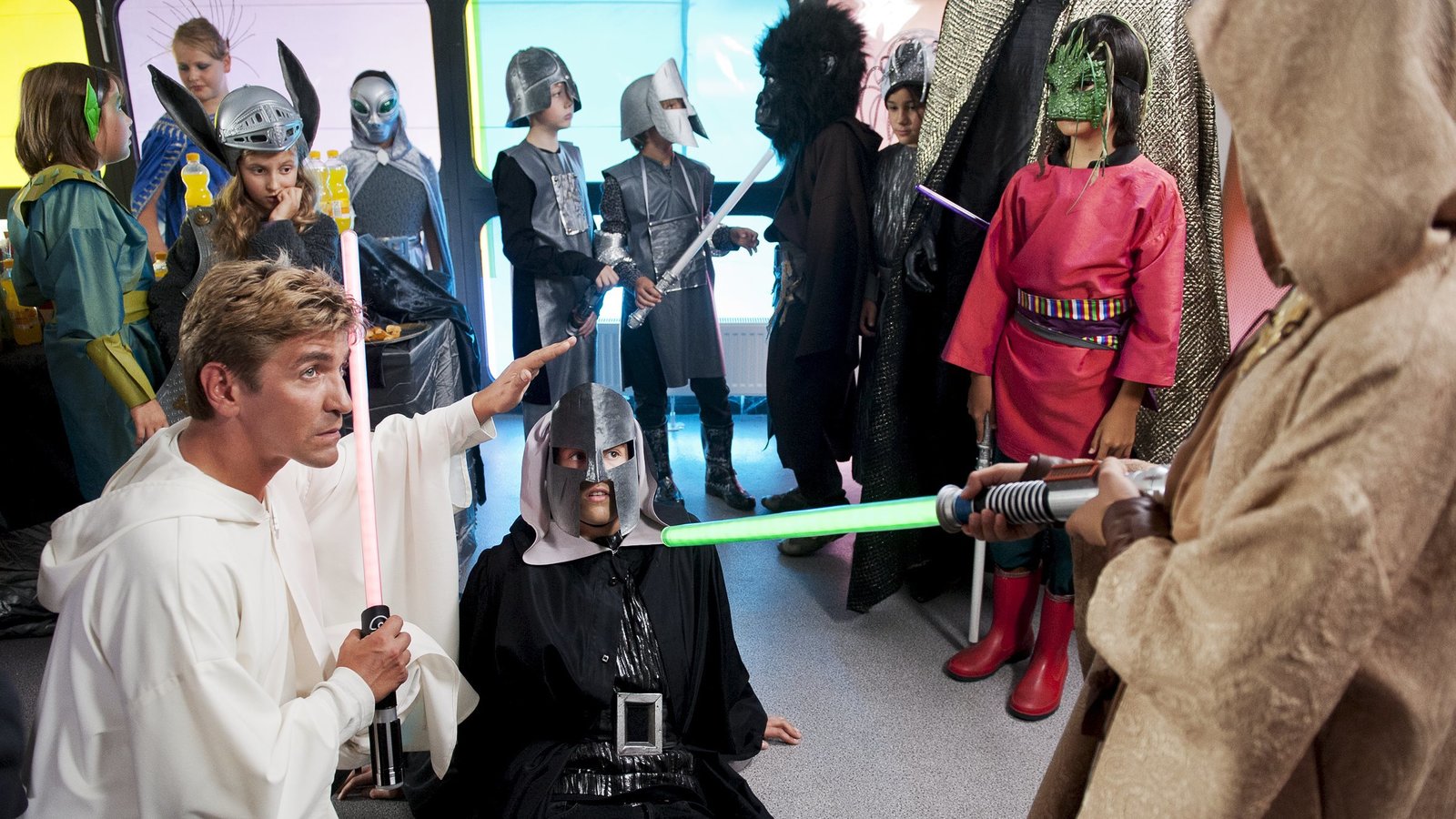 Laser - Die Jagd nach dem LichtschwertAuf der Science-Fiction-Party ist Fritz Fuchs (Guido Hammesfahr, l.) dem Dieb des Laserschwertes auf der Spur.Bild: © ZDF und Antje Dittmann.