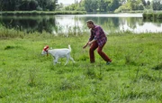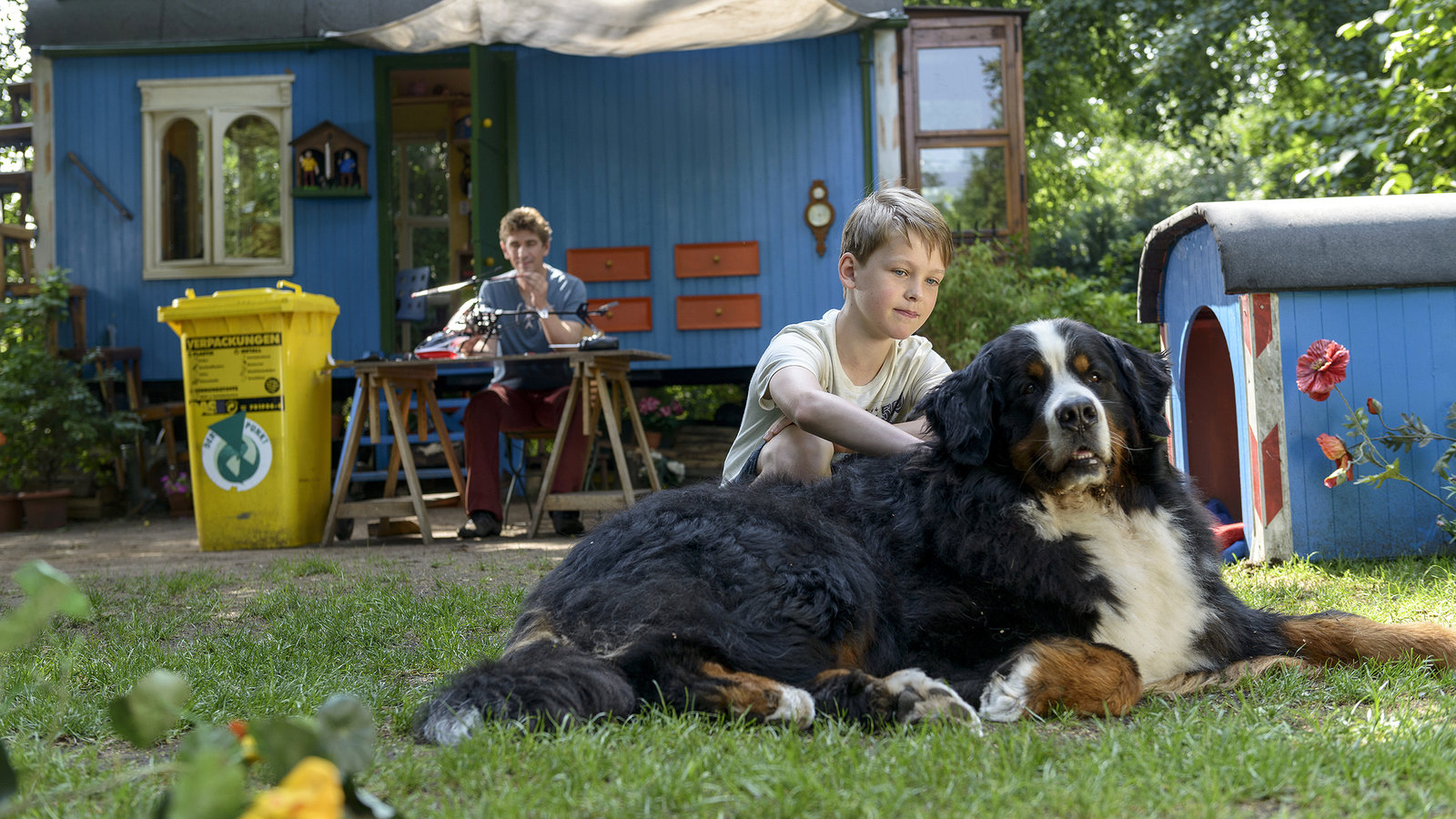 Waschbär - Die wilde WGFritz Fuchs (Guido Hammesfahr, links) und 'Lausejunge' Victor (Finn Fiebig, rechts) am Bauwagen. Keks genieüt die Extra-Streicheleinheiten.ÂBild: © ZDF/Antje Dittmann