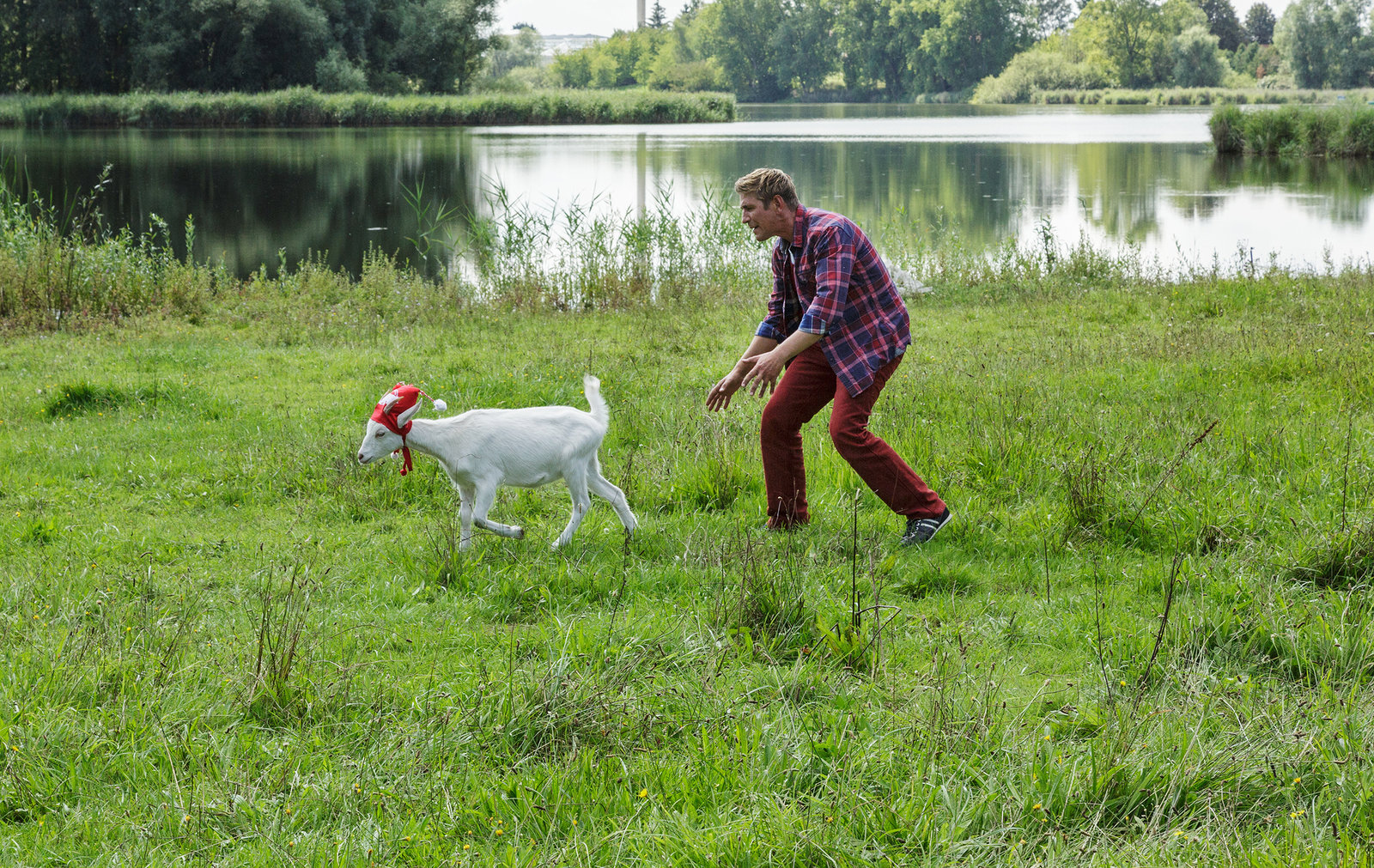 Ziege - Die verrückte EntführungFritz Fuchs (Guido Hammesfahr) versucht, Ziege Rosalie einzufangen. Sie soll die nächsten Tage bei ihm wohnen, damit er sie vor den Entführern beschützen kann.Bild: © ZDF/Antje Dittmann