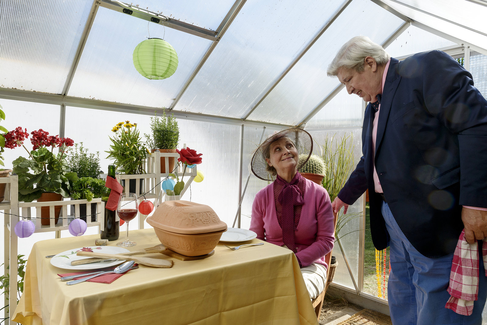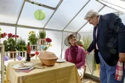 Fliege - Das verflixte TreffenNachbar Paschulke (Helmut Kraus, r.) und Mutti Kluthe (Margot Nagel, l.) haben ihr erstes Treffen. Mutti Kluthe fühlt sich im Gewächshaus noch ganz wohl, doch dies wird sich schnell ändern.Bild: © ZDF/Antje Dittmann