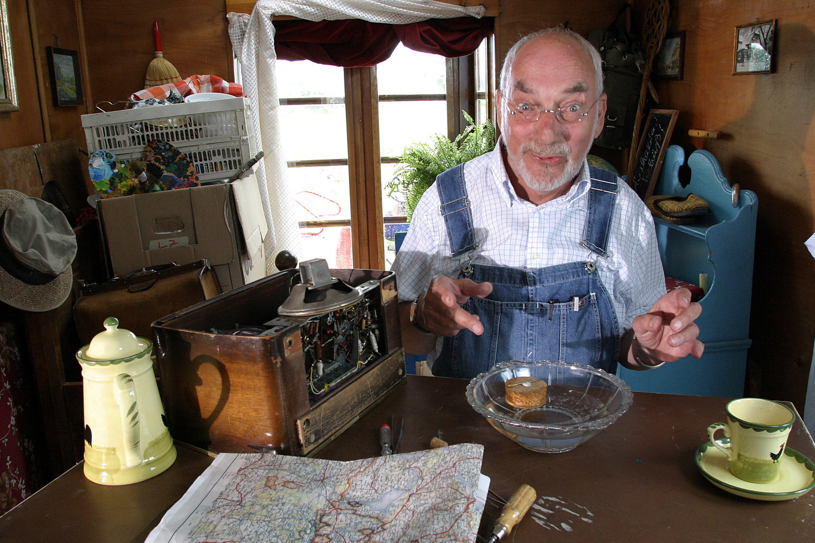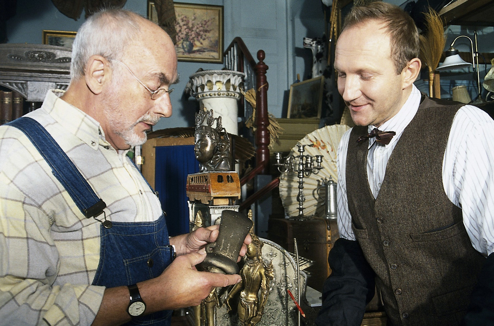 Peter und die KupferkannePeter (Peter Lustig, l.) will im Antiquitätsladen bei Herrn Windig (Alexander Hauff, r.) ein Geburtstagsgeschenk für Tante Elli kaufen - edel soll es sein und aus Metall.Bild: © ZDF und Chritiane Pausch
