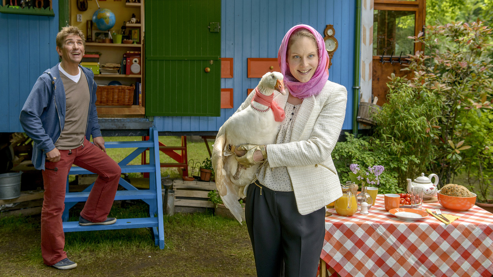 Gans - Die verschwundene DivaStolz zeigt Fritz Fuchs (Guido Hammesfahr, l.) seinem Besuch Dorle (Tessa Mittelstaedt, r.) und Gans Gloria sein Zuhause.Bild: © ZDF/Antje Dittmann