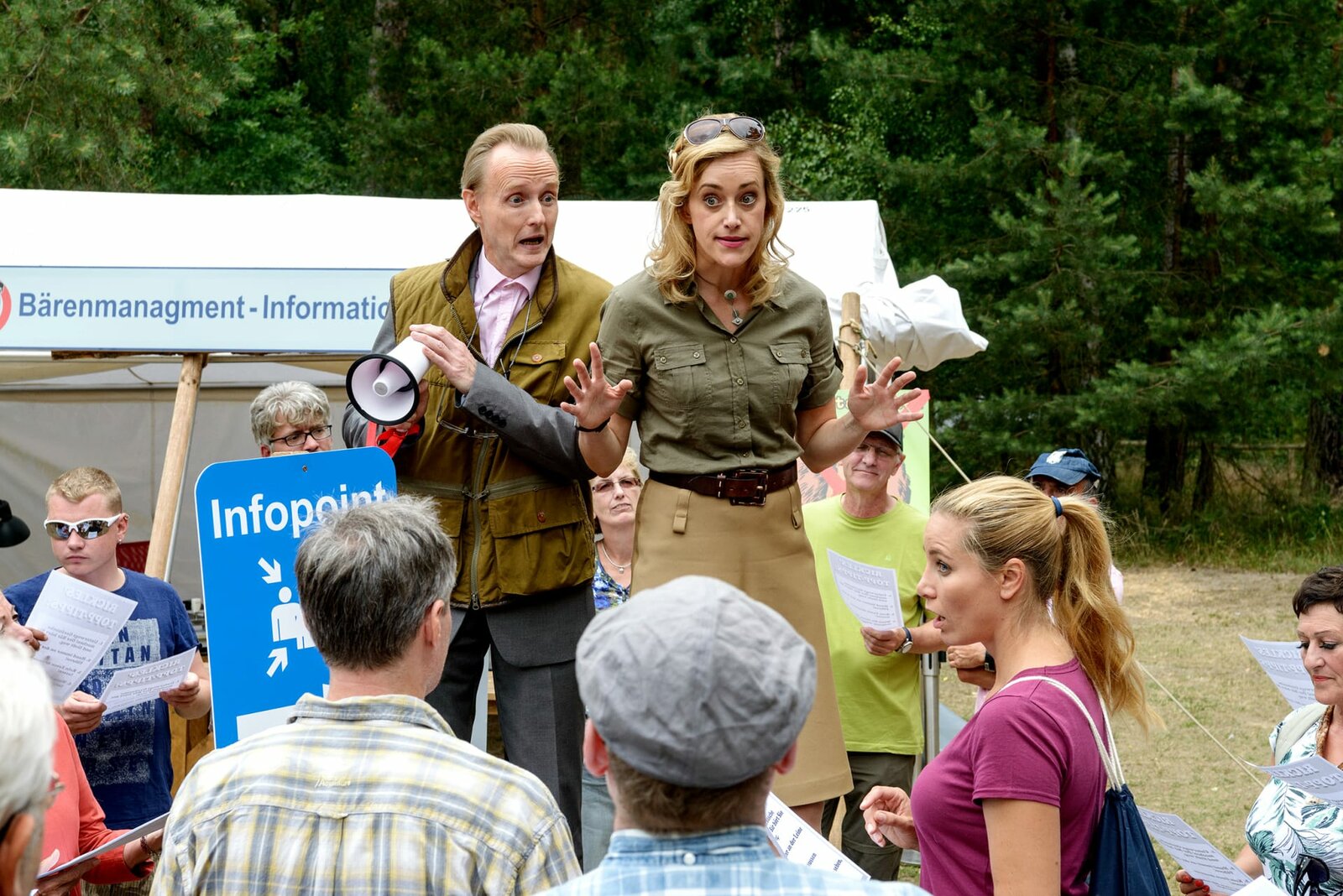 Bär - Alarm im StadtwaldHerr Kluthe (Holger Handtke, links) vom Ordnungsamt hat alle Hände voll zu tun. Ein Bär soll in Bärstadt sein Unwesen treiben und eine Bärenkennerin (Judith Richter, rechts) will Herrn Kluthe beim Vertreiben des Bären unterstützen.Bild: © ZDF/Antje Dittmann