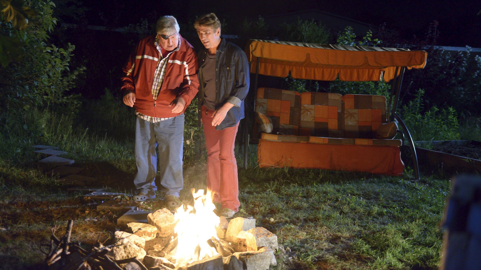 Feuersalamander - Jagd auf den LurchFritz Fuchs (Guido Hammesfahr, r.) wird misstrauisch: Nachbar Paschulke (Helmut Krauss, l.) plant irgendetwas Merkwürdiges, das mit seinen Salamandern und dem Feuer zu tun hat.Bild: © ZDF und Antje Dittmann