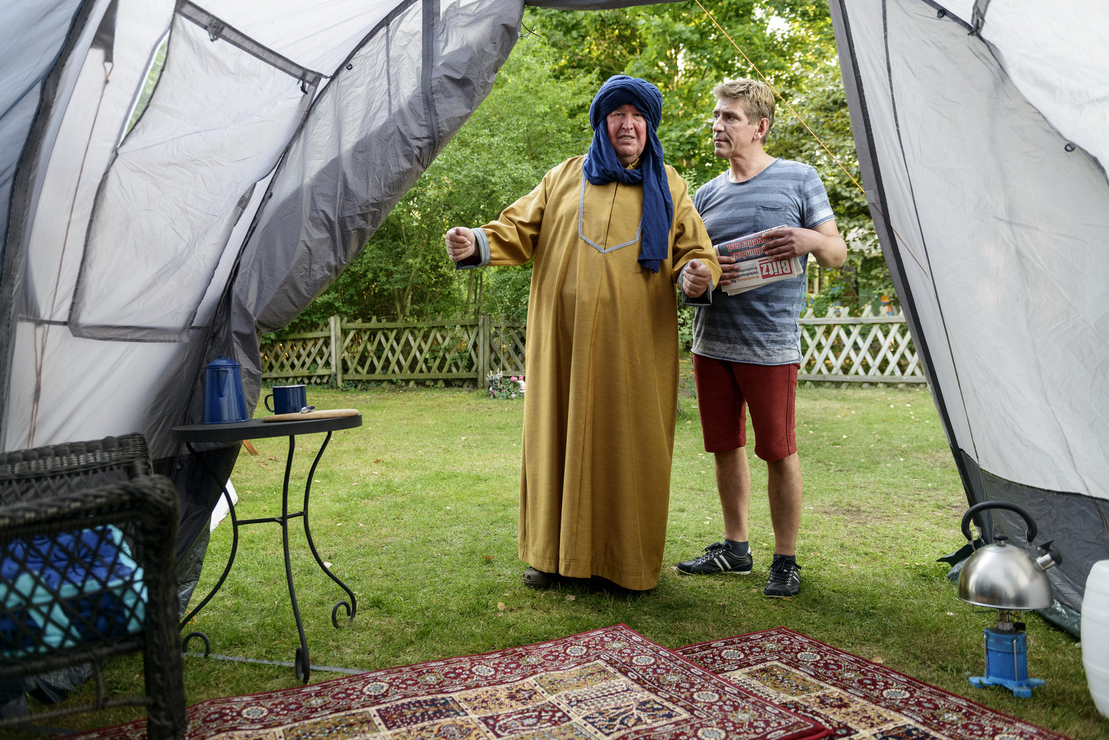 Mistkäfer - Die wundersame VerwandlungFritz Fuchs (Guido Hammesfahr, r.) wundert sich über Herrn Paschulkes (Helmut Krauss, l.) Aufmachung. Gekleidet wie ein Beduine möchte der vor einem drohenden Sturm Schutz suchen.Bild: © ZDF und Antje Dittmann