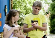 Katzen - Streuner auf samtigen PfotenLea (Emilia Holstein) hat ihr kleines Kätzchen wieder. Fritz Fuchs (Guido Hammesfahr) hatte es gefunden und gepflegt.Bild: © KiKA