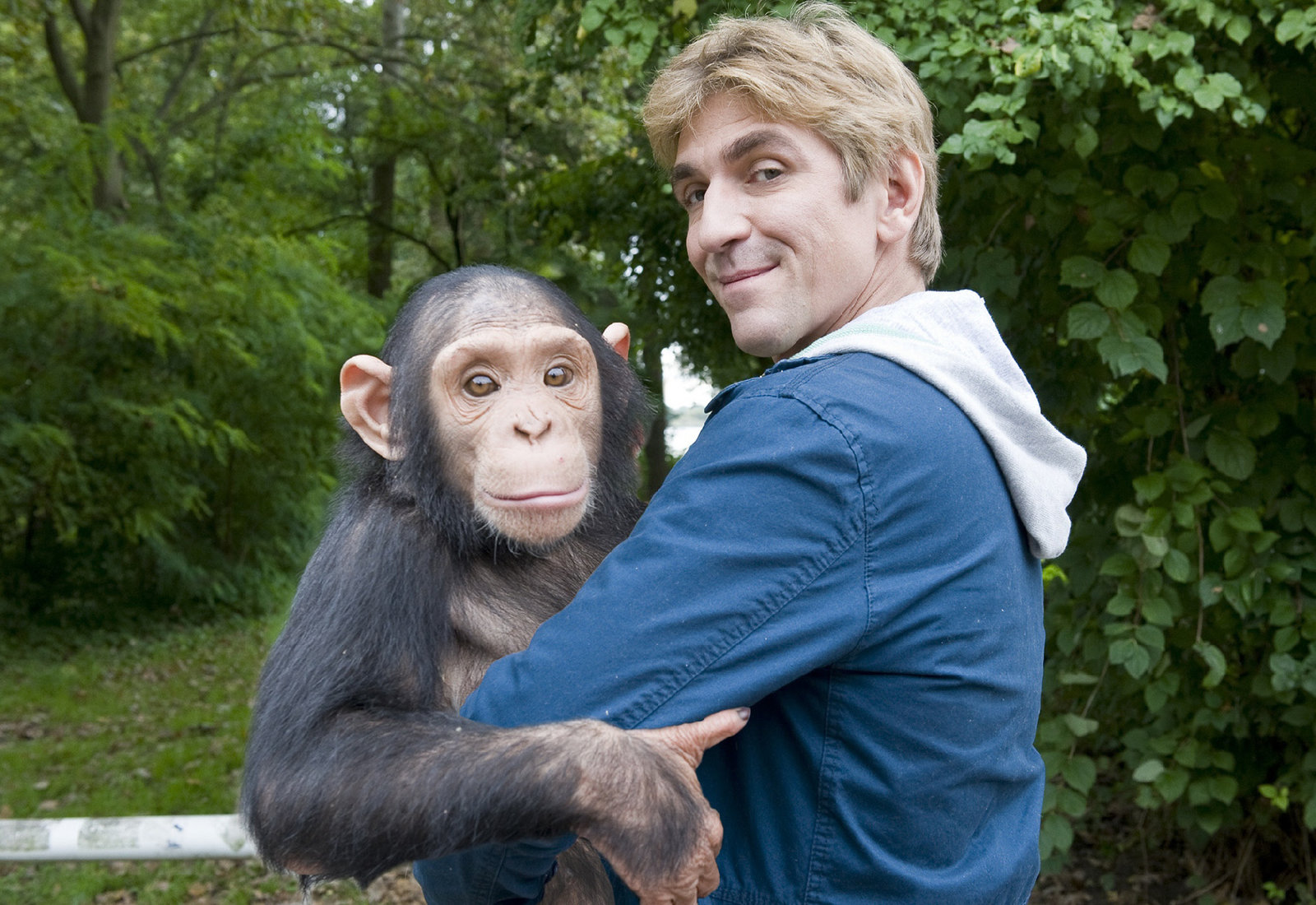 Zähne - Der unheimliche BissFritz Fuchs (Guido Hammesfahr) und der kleine Schimpanse mögen sich wirklich.Bild: © ZDF/Antje Dittmann