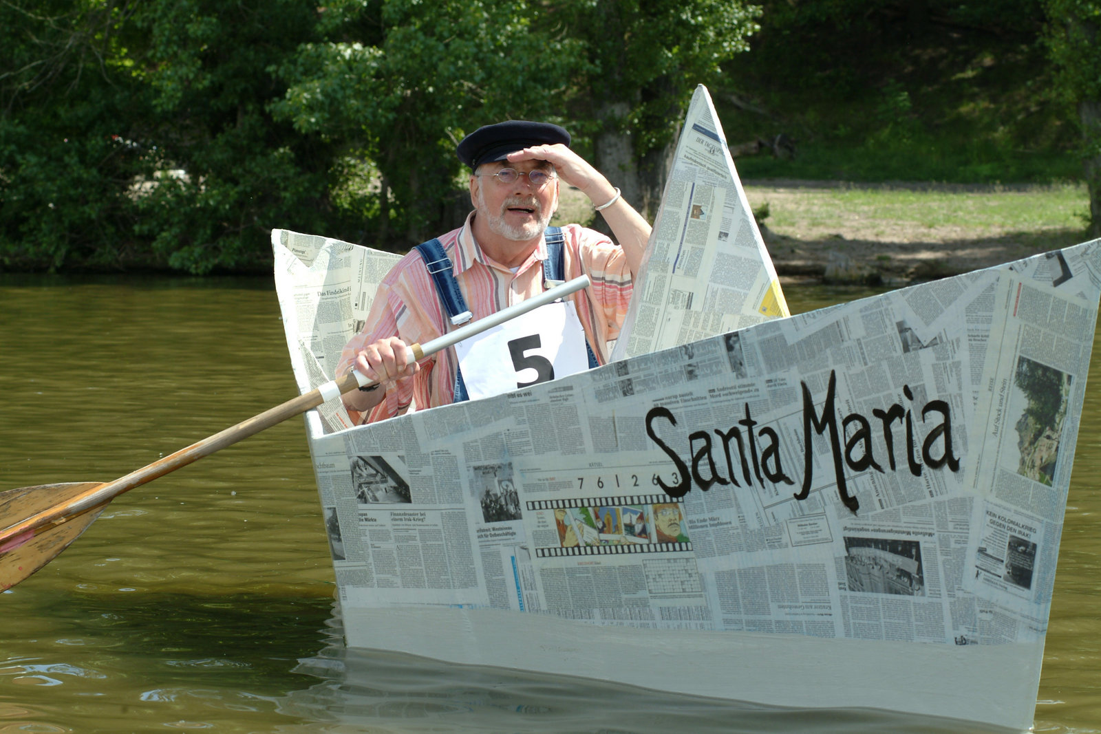 Peters Boot ist nicht von PappePeter (Peter Lustig) nimmt mit seinem Papierboot "Santa Maria" an der Bärstädter Papierbootregatta teil.Bild: © ZDF und Christiane Pausch