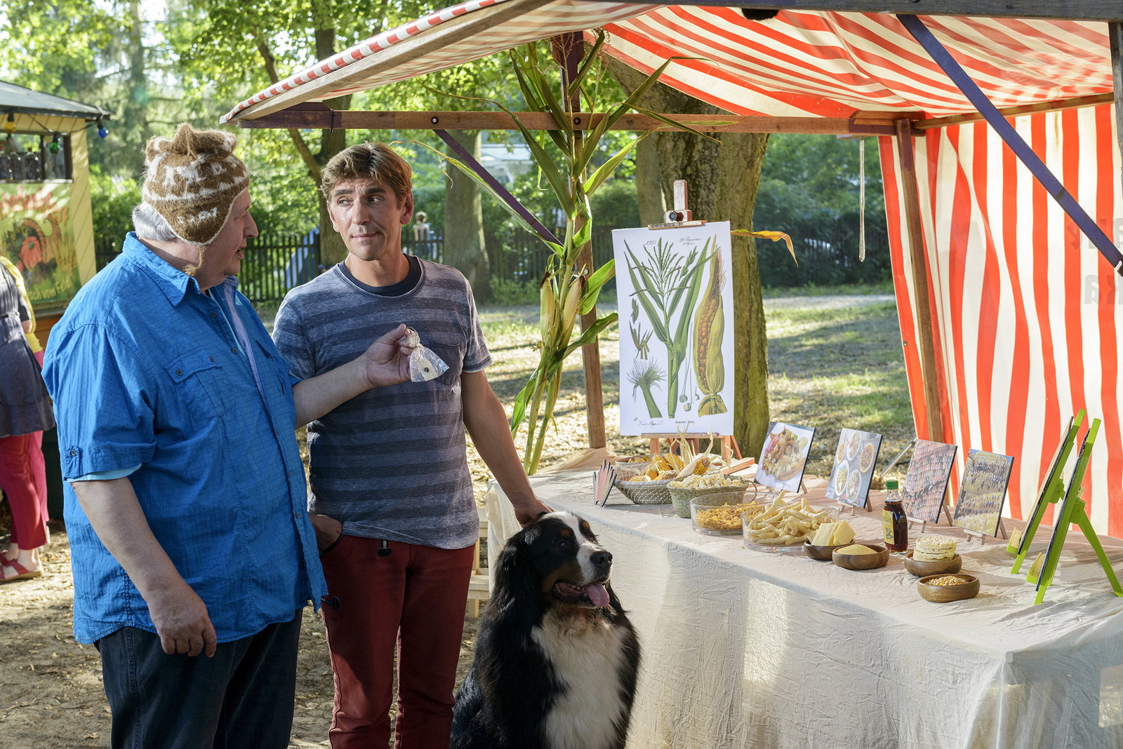 Mais - Der Schwindel im LabyrinthNachbar Paschulke (Helmut Krauss, l.) beschimpft Fritz Fuchs (Guido Hammesfahr, r.) als Lügner: Niemals könne Mais solche Wunder vollbringen, wie der aztekische Samen, den er für teures Geld erworben hat.Bild: © ZDF/Antje Dittmann