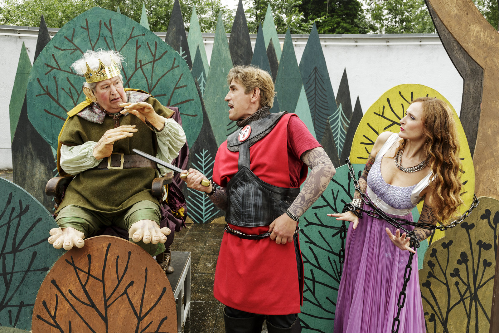 Stimme - Ein Lied für BärstadtFritz (Guido Hammesfahr, M.) als Ritter Heinrich kämpft gegen den Koboldkönig, dargestellt von Herrn Paschulke (Helmut Krauss, l.), um die schöne Mechthild alias Trixi Röse (Deborah Kaufmann, r.) zu befreien.Bild: © ZDF und ZDF / Antje Dittmann