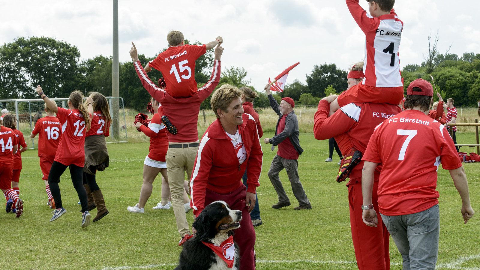Fußball - Das Wunder von BärstadtDas gibt's doch nicht - Spiel gedreht, Derby-Sieg! Fritz Fuchs (Guido Hammesfahr, vorne Mitte mit Hund Keks ) freut sich mit der Bärstädter Fußballjugend.Bild: © ZDF und Antje Dittmann