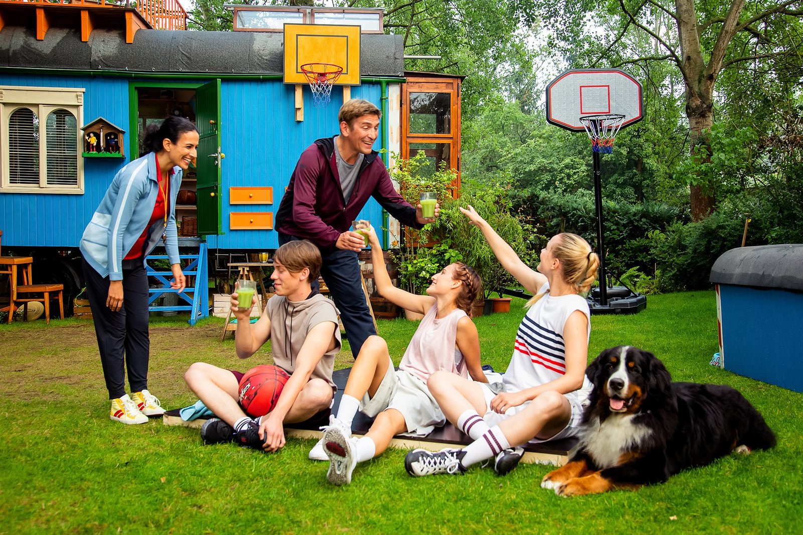 E-Sport - Das knallharte TrainingscampZum E-Sport gehört wie zu jedem anderen Sport auch gesunde Ernährung. Fritz (Guido Hammesfahr, M.) und Yasemin (Sanam Afrashteh, l.) haben den Jugendlichen was Leckeres gemixt. Finn (Alvar Goetze, 2.v.l.), Adriana (Federica Garcin, 2.v.r.) und Nikki (Jacqueline Wangemann, r.) freuen sich.Bild: © ZDF und Andrea Hansen Fotografie./Andrea Hansen Fotografie