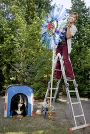 Müll - Kampf der vollen TonneAus Abfällen hat Fritz Fuchs (Guido Hammesfahr) für seinen Hund Keks ein Windrad mit Ventilator gebaut.Bild: © ZDF und Antje Dittmann