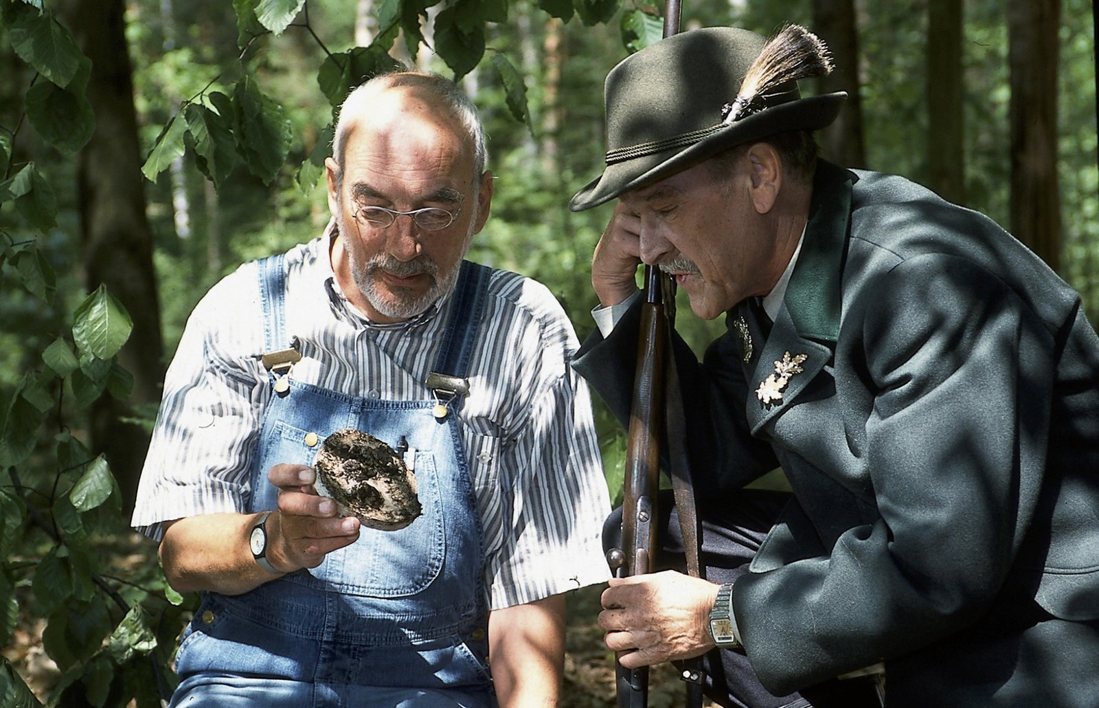 Peter und die WölfePeter (Peter Lustig) ist auf Wolfssuche. Mitten im Wald entdeckt er verdächtige Tier- Spuren- der Förster (Jörg Friedrich) hilft Peter bei der Bestimmung.Bild: © ZDF und Christiane Pausch