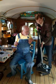 Bei Peter staubt'sPeter (Peter Lustig) hat überhaupt keinen Bedarf an einem Staubsauger, den ihm der Vertreter (Gode Benedix) mit allen Mitteln anpreistBild: © ZDF und Christiane Pausch