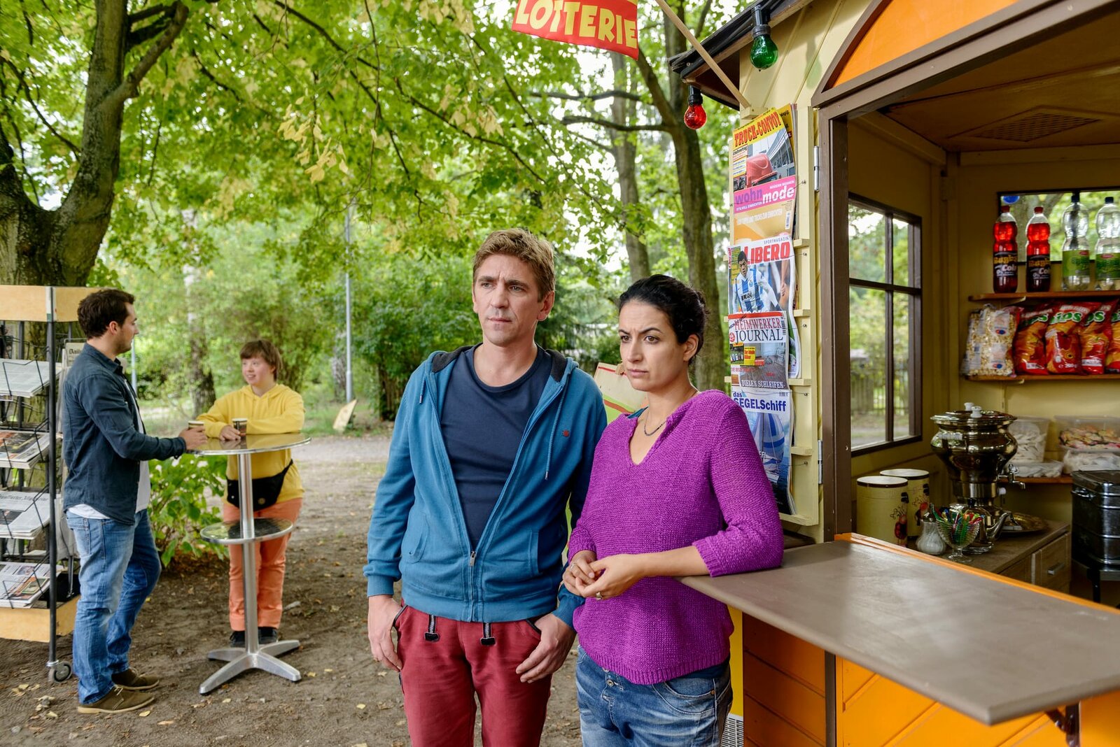 Marder - Der rätselhafte GastFritz Fuchs (Guido Hammesfahr) findet es nicht witzig, dass Ringa (Susanne Wolf) eine Tierfalle nahe beim Bauwagen gebuddelt hat.Bild: © ZDF und Andrea Hansen Fotografie.