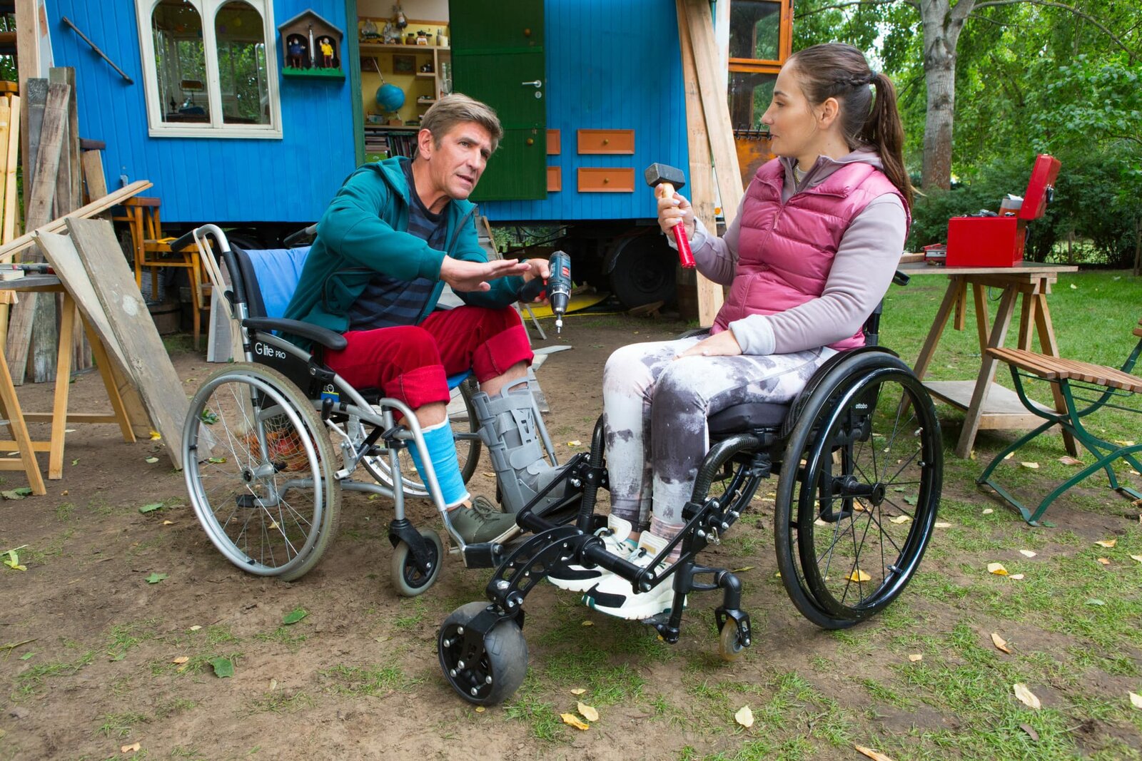 Gemeinsam stark - Eine Rampe für die RollisFritz Fuchs (Guido Hammesfahr) muss nach einem Unfall für sechs Wochen im Rollstuhl sitzen. Zum Glück lernt er Julia (Kristina Vogel) kennen, die selbst im Rollstuhl sitzt. Sie gibt Fritz Tipps für seinen Alltag als "Rolli" - voller neuen Hindernissen und Herausforderungen. Die beiden beschließen, gemeinsam eine Rampe für den Bauwagen zu bauen.Bild: © ZDF und Zia Ziarno.