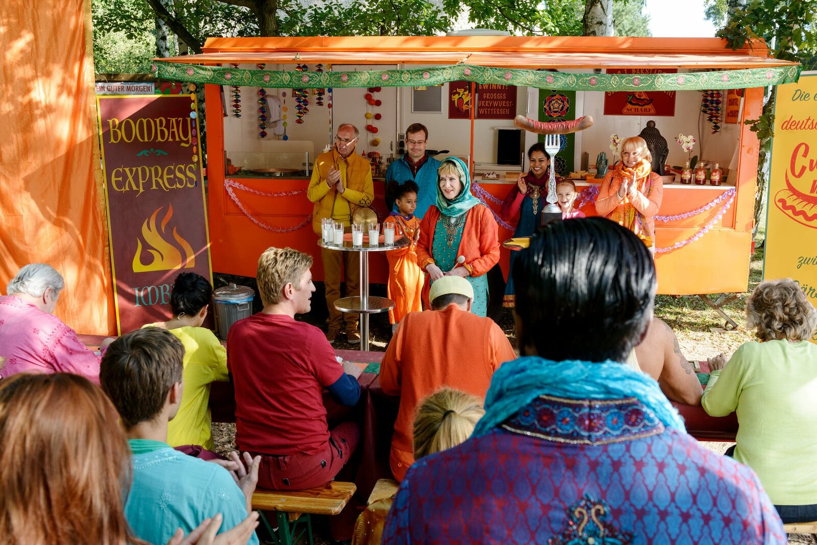 Gewürze - Der extra scharfe WettstreitIndira (Beatrice Richter, hinten Mitte) kündigt dem begeisterten Publikum den großen Schärfewettbewerb an.Bild: © ZDF und Antje Dittmann./Antje Dittmann