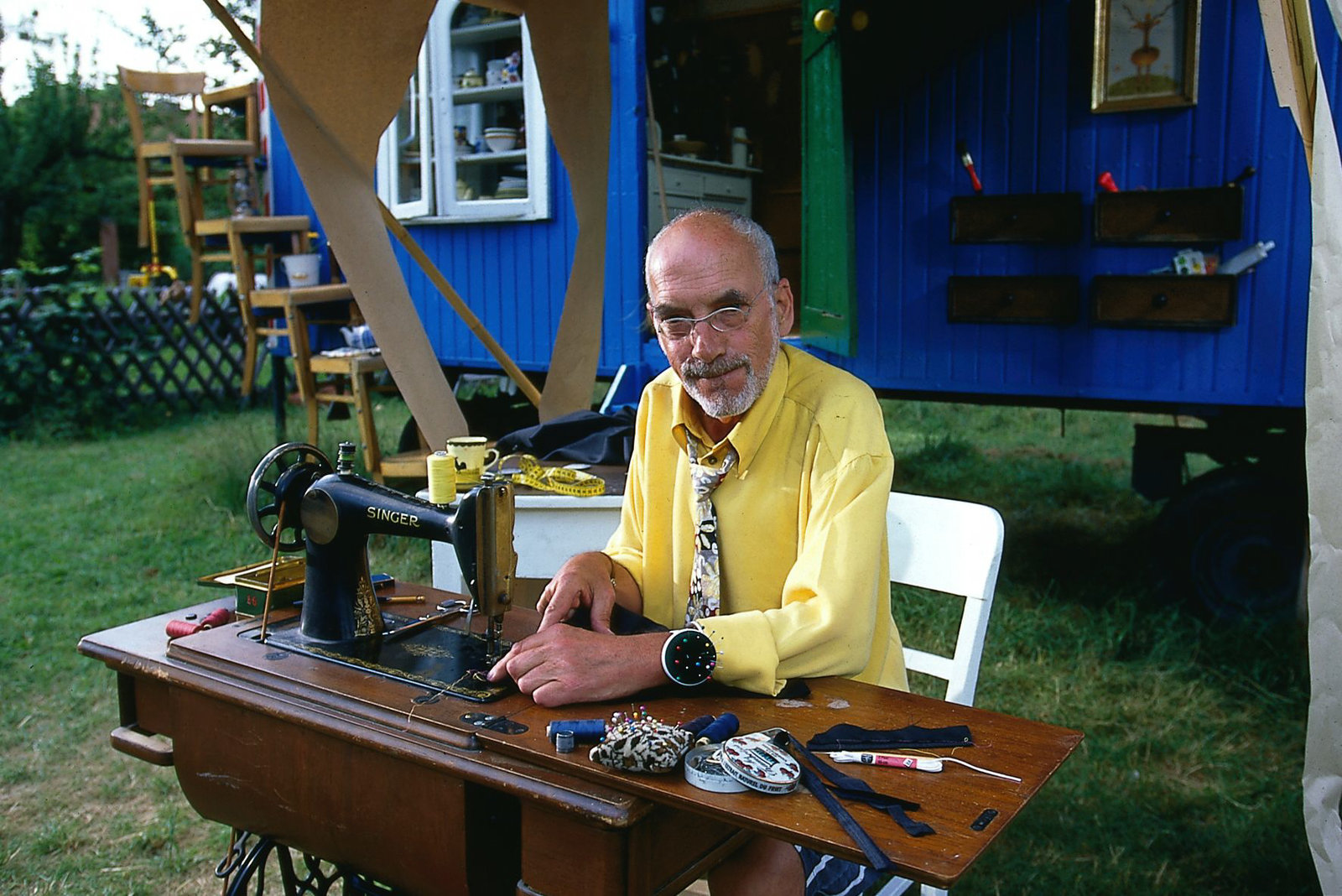 Peters famose HosePeter (Peter Lustig Bauwagen) hat beschlossen, sich aus seinem Anzug, den er sich für sein Fest "20 Jahre in Bärstadt" gekauft hat, eine bequeme Latzhose zu schneidern.Bild: © ZDF und Christiane Pausch