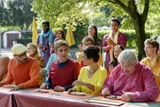 Familie (1) - Die beste BandeNoch ist die Welt beim Familientreffen in Ordnung. Doch dann haut Leni (Luise Kretschmer, 2.v.r.) ab. Sie hat Fritz (Guido Hammesfahr, r.) und ihrer Mutter (Eva Mannschott, 3.v.r.) eröffnet, dass sie glaubt, als Baby vertauscht worden zu sein. Im Hintergrund: Jonas (Emil Baikousis, l.), Oma Ilse (Urs Conradi, 2.v.l.).Bild: © ZDF und Andrea Hansen Fotografie.