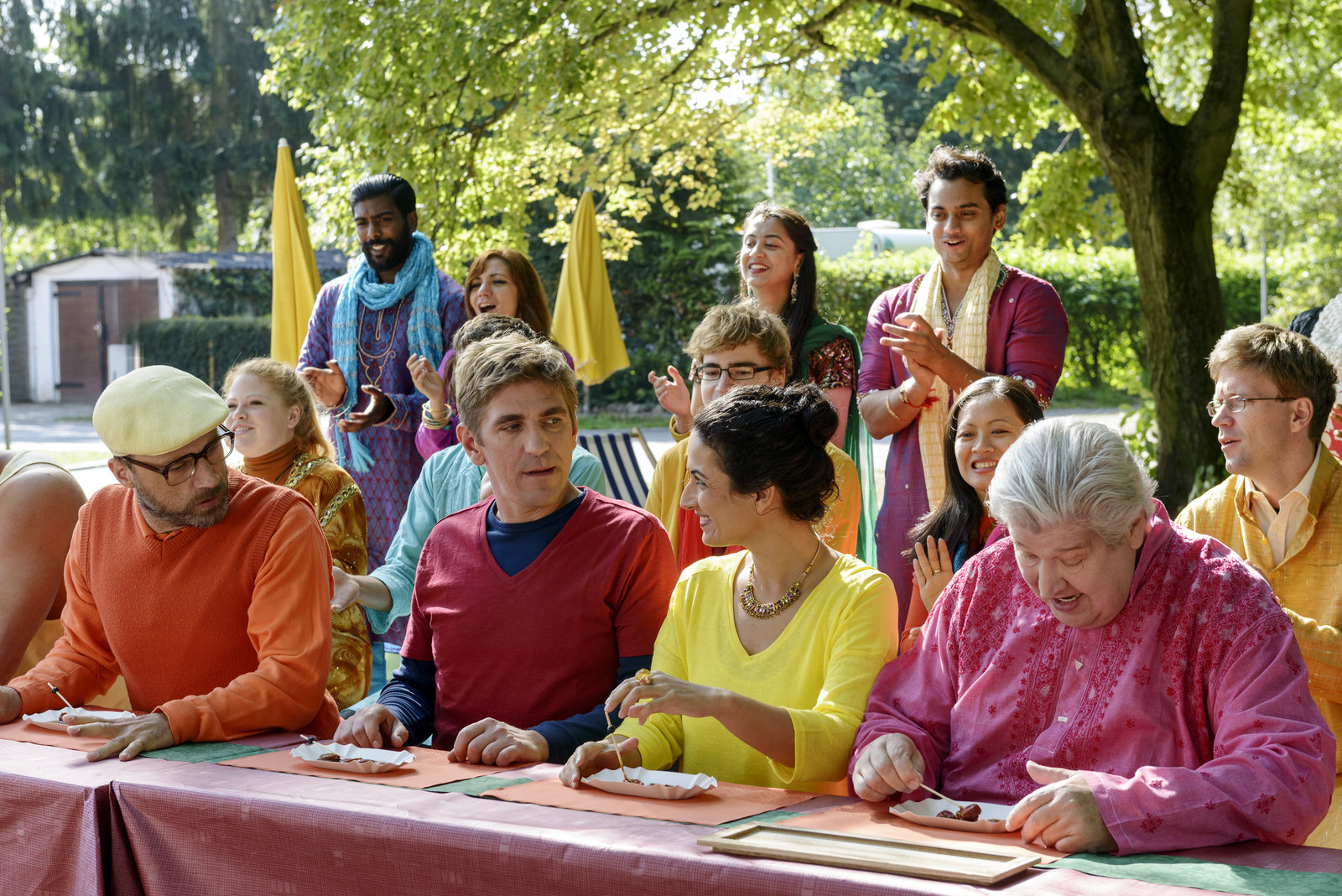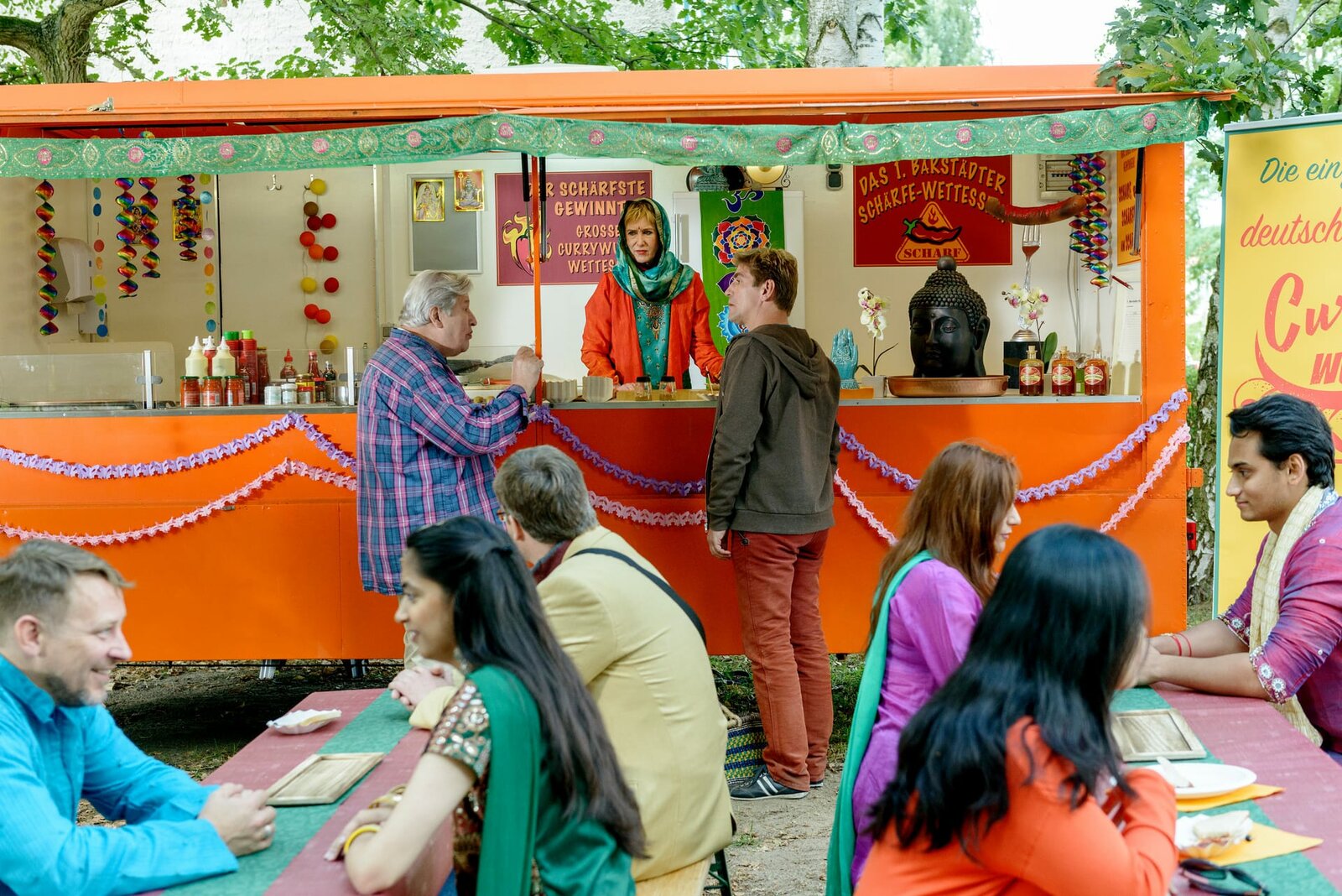 Gewürze - Der extra scharfe WettstreitAm indischen Currywurst-Stand von Indira (Beatrice Richter, hinten Mitte) treffen sich die beiden Streithähne Fritz Fuchs (hinten, r.) und Nachbar Paschulke (hinten, l.) fürs Schärfewettessen.Bild: © ZDF und Antje Dittmann./Antje Dittmann