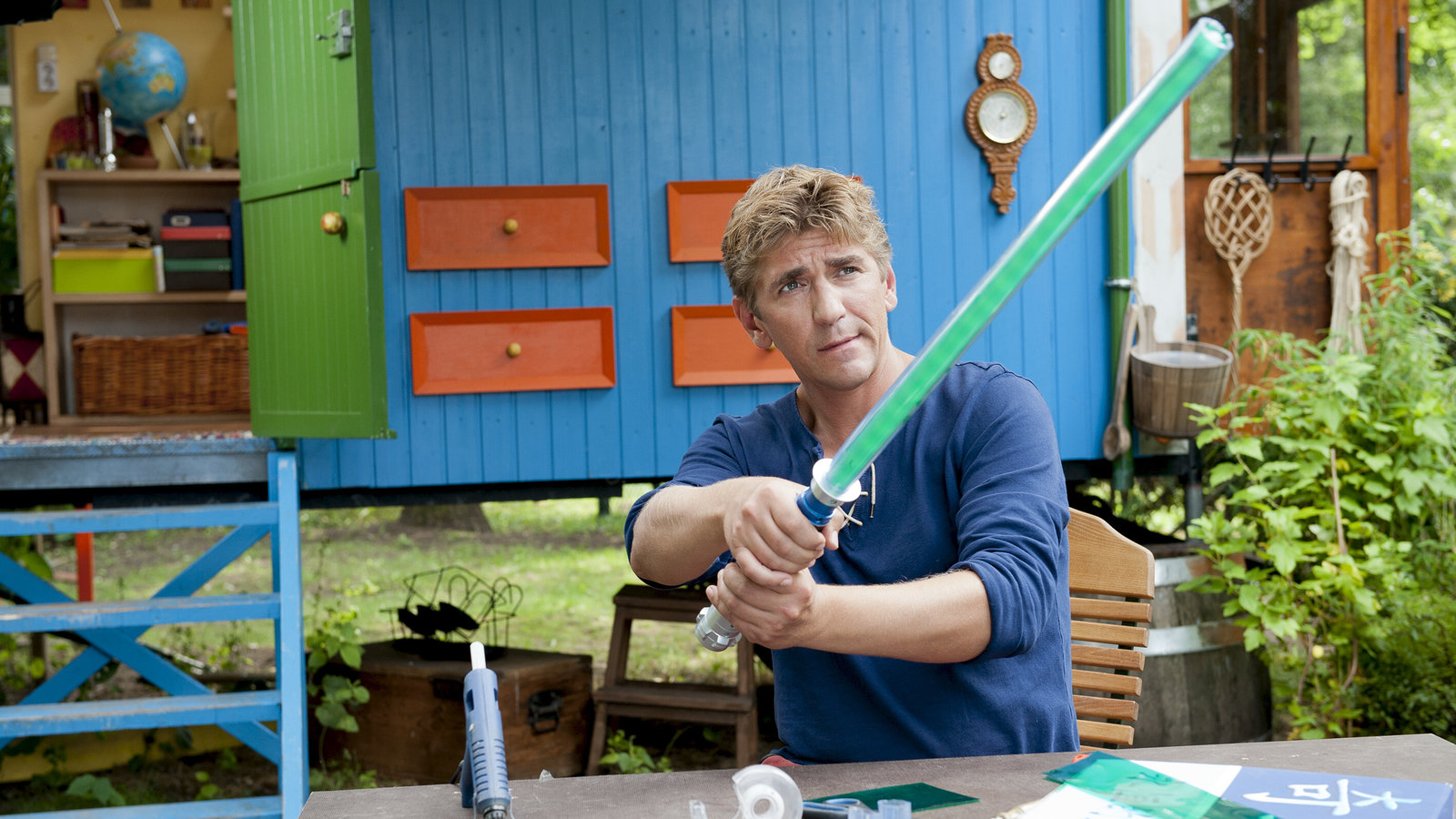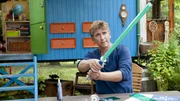 Laser - Die Jagd nach dem LichtschwertFritz Fuchs (Guido Hammesfahr) konstruiert für sein Patenkind ein geniales Lichtschwert.Bild: © ZDF und Antje Dittmann