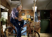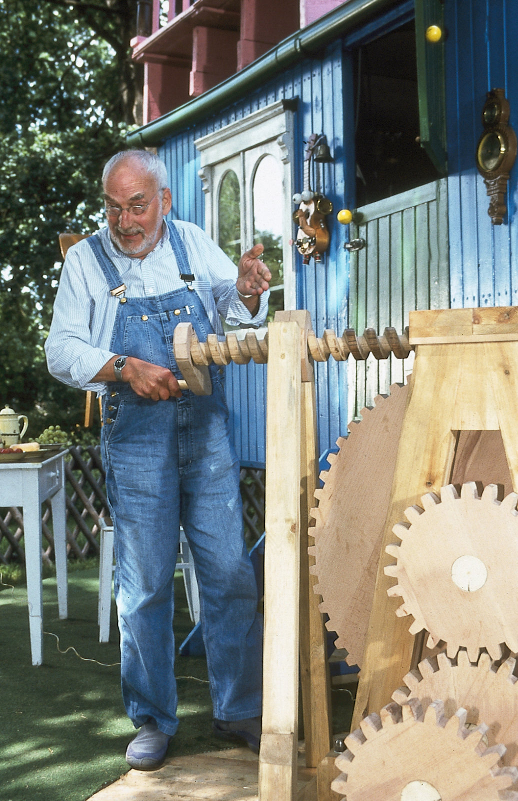 Peter dreht sein HausMit seiner genialen Zahnradkonstruktion schafft es Peter (Peter Lustig) seinen gesamten Bauwagen auf einer Plattform immer dem Sonnenlicht entgegen zu drehen. (Ukulele)Bild: © ZDF und Christiane Pausch