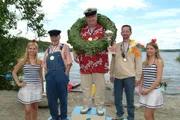 Peters Boot ist nicht von PappePeter (Peter Lustig, 2.v.l.) wurde bei der Bärstädter Papierbootregatta knapp von Paschulke (Helmut Krauss, M.) geschlagen. Die Siegerehrung wird gefeiert.Bild: © ZDF und Christiane Pausch