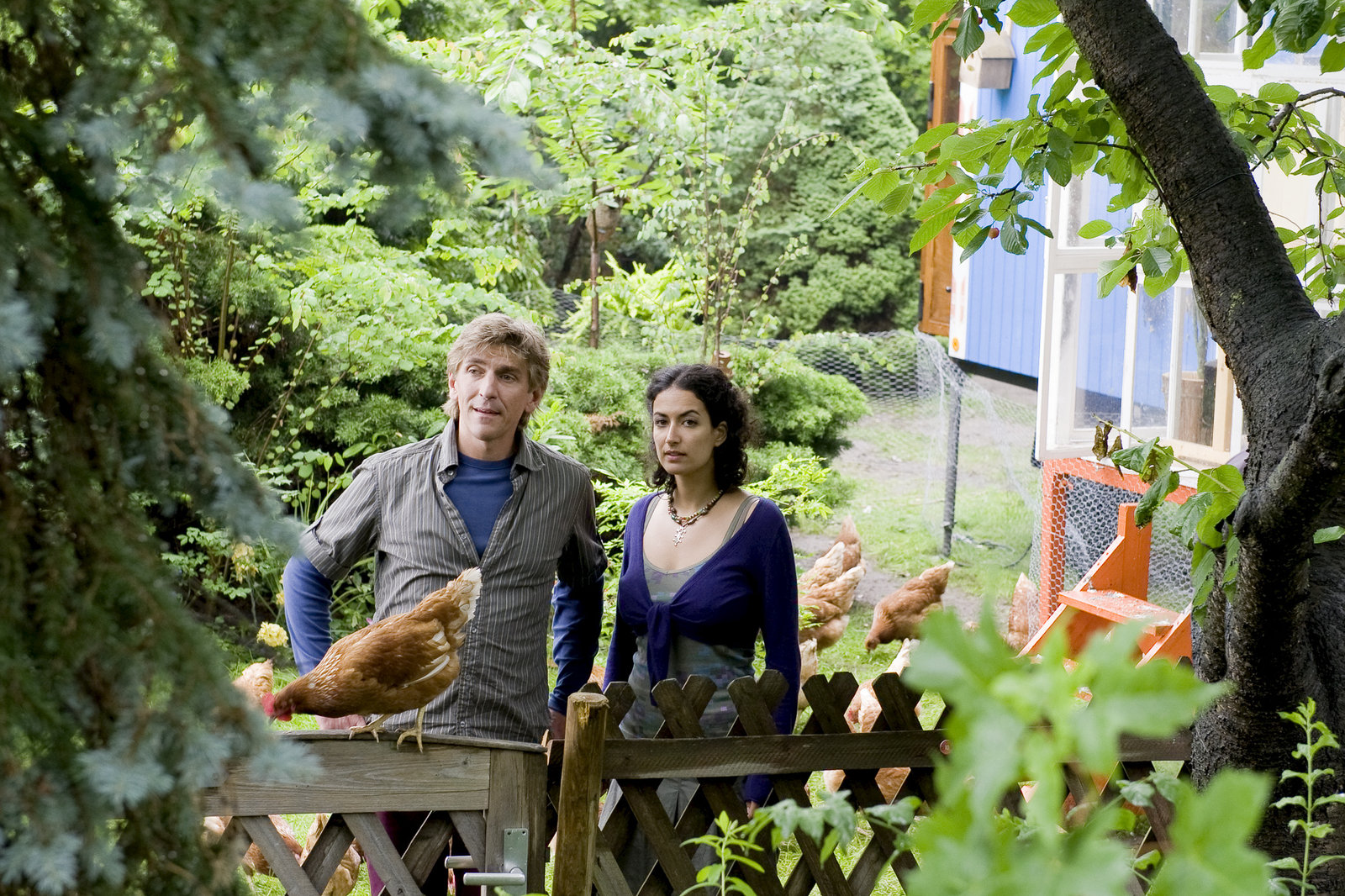 Hühner - Das große GackernFritz Fuchs (Guido Hammesfahr, l.) und Freundin Yasemin (Sanam Afrashteh, r.) sind skeptisch, wo soll Fritz nur mit all den Hühnern hin?Bild: © ZDF und Antje Dittmann