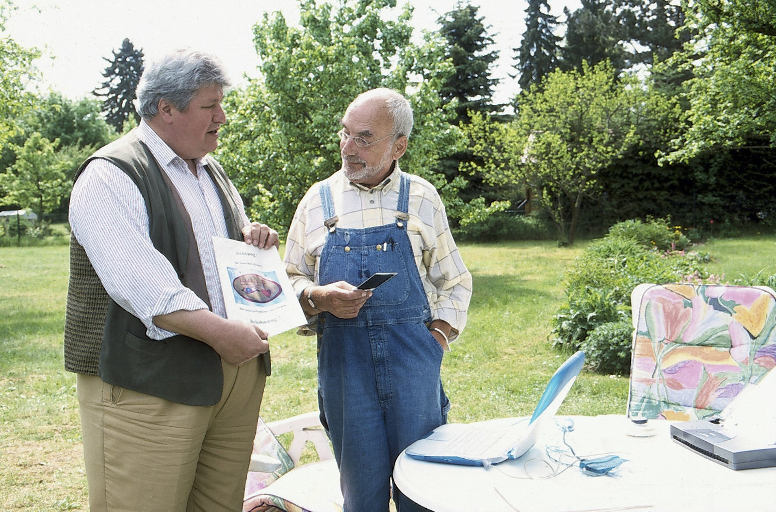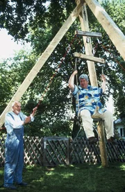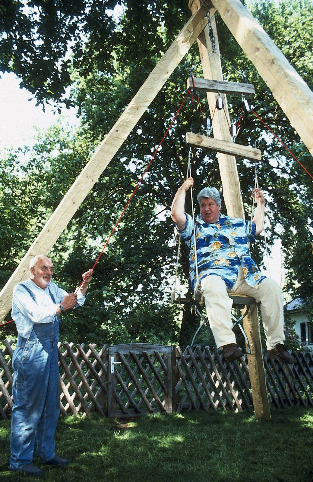 Peter dreht sein HausPeter (Peter Lustig, links) hat einen Flaschenzug konstruiert. Sein kräftig gebauter Nachbar Paschulke (Helmut Krauss, rechts) dient ihm als Testobjekt.Bild: © ZDF und Christiane Pausch